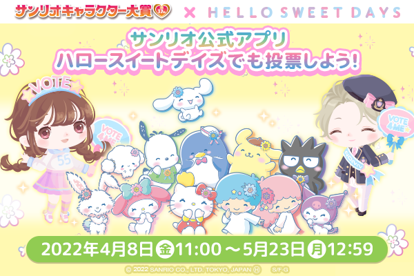 ココネ株式会社(本社:東京都世田谷区、以下「ココネ」)は、株式会社サンリオのハローキティやマイメロディ、リトルツインスターズ(キキ&ララ)などが登場する着せかえアバターアプリ『ハロースイートデイズ』にて、「2022年サンリオキャラクター大賞」の公式投票に参加できるイベントを開催中です。