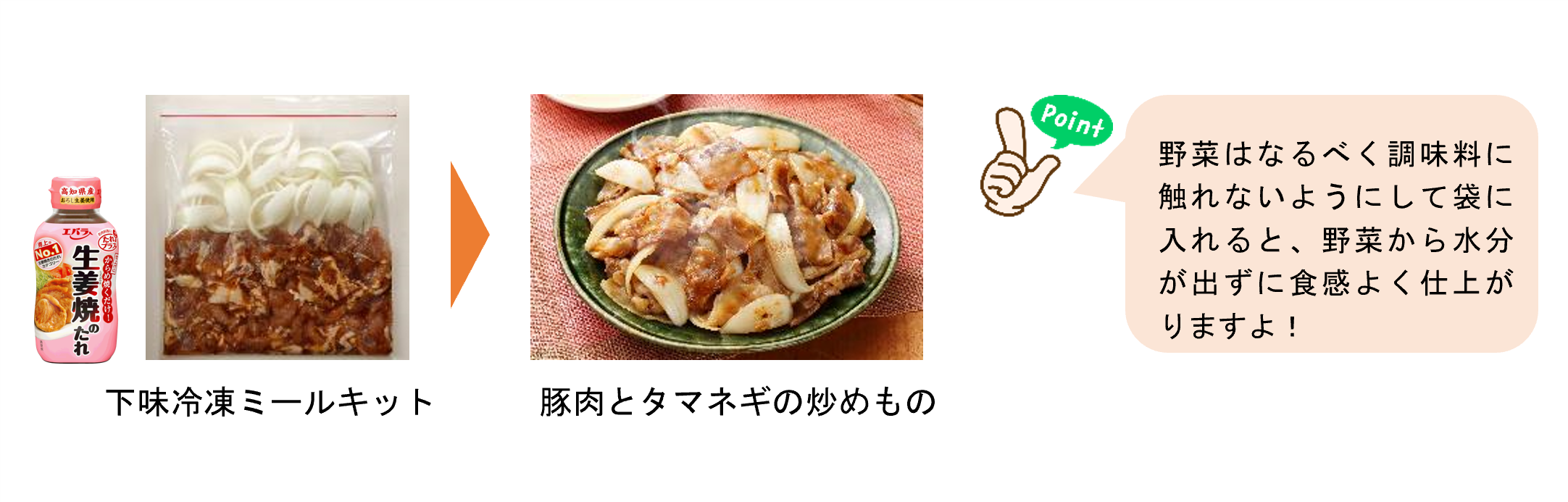 例えば、豚肉に「生姜焼のたれ」をもみ込み、くし形にカットしたタマネギと一緒に袋に入れるだけで、“豚肉とタマネギの炒めもの”の「下味冷凍ミールキット」が完成します。「お肉料理に!たれプラス」シリーズは、全9品の豊富なラインアップを展開しているため、同じ食材を使ってもたれを変えるだけで多彩な味わいのメニューにアレンジすることができます。