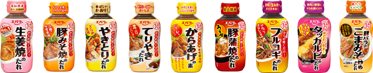(「生姜焼のたれ」「豚みそ焼のたれ」「やきとりのたれ」「てりやきのたれ」「からあげの素」「豚蒲焼のたれ」「プルコギのたれ」「タッカルビのたれ」「豚バラのごまみそ炒めのたれ」)