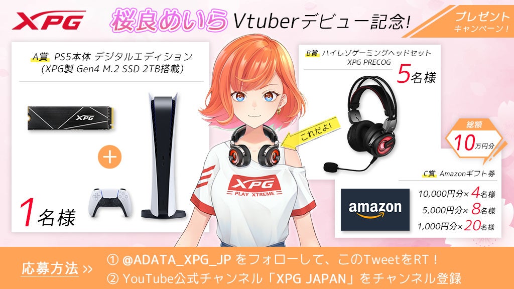 「桜良めいら」のデビューを記念いたしまして、4月28日よりADATA / XPG公式Twitterをフォロー、対象のツイートをリツイートおよび公式YouTubeチャンネル「XPG JAPAN」にチャンネル登録することで「PS5デジタルエディション+XPG製 容量増設2TB SSDセット」または、ハイレゾゲーミングヘッドセット「XPG PRECOG」やAmazonギフト券総額10万円が当たるキャンペーンをADATA / XPG公式Twitterアカウント上で開催します。