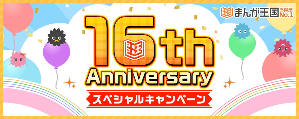 『まんが王国』は2006年のサービス開始以来、多くのお客さまに支えられ、このたび16周年を迎えました。日頃のご愛顧に感謝し、多くの方々がもっとお得に、より多くの魅力的な作品と出会えることを願って、特別なキャンペーンをご用意いたしました。