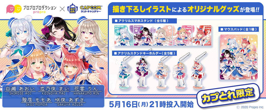 今回のコラボレーションでは、プロプロプロダクションの2期生「白瀬 あおい」、「恋乃夜 まい」、「花雲 りん」、「憩居 ももあ」、「咲夜 あずさ」5名のカプとれ限定のプライズ景品を展開いたします。
