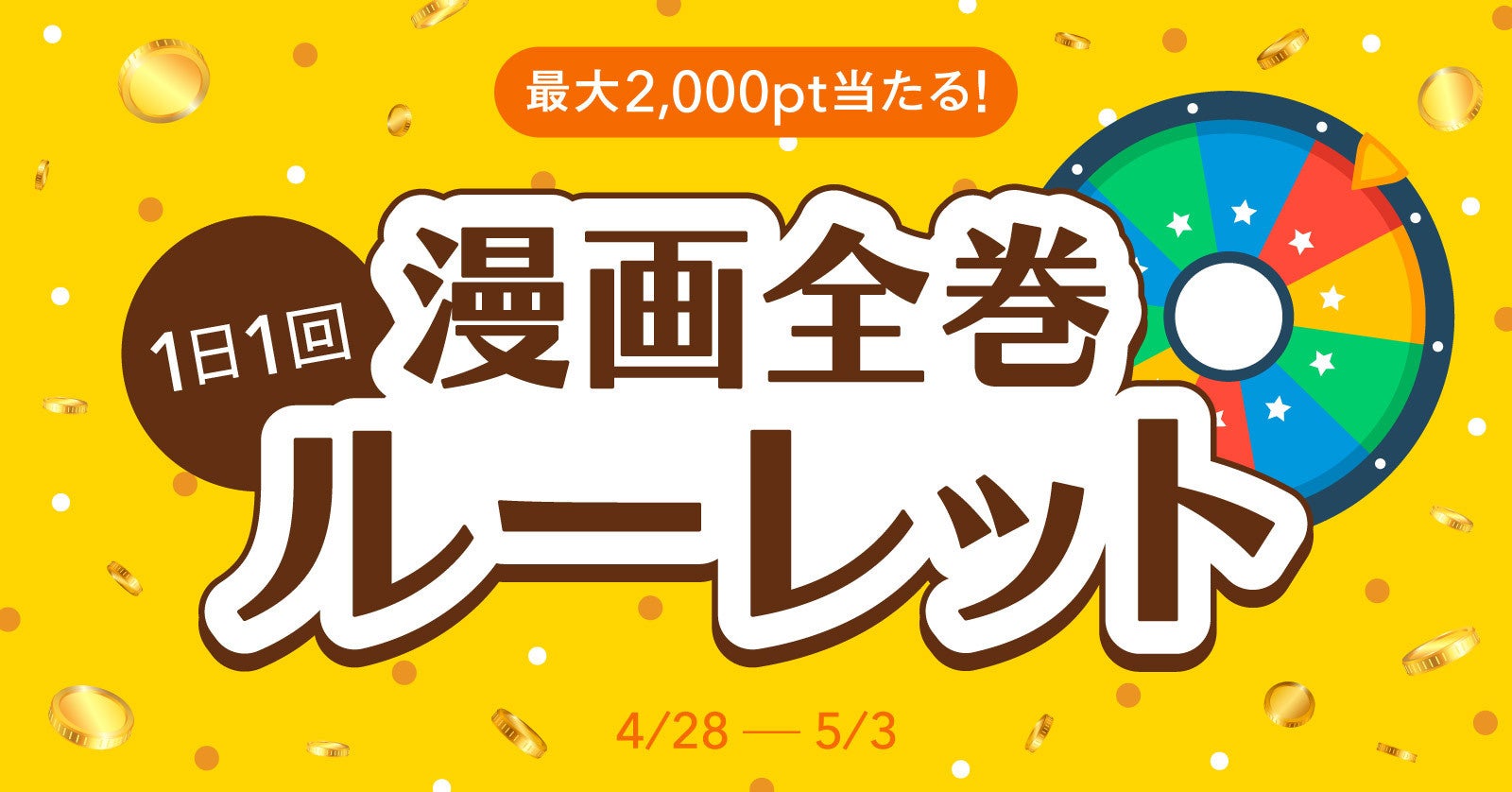 株式会社TORICO(本社:東京都千代田区、代表取締役社長:安藤拓郎)が運営するECサイト「漫画全巻ドットコム」、及びECアプリ「漫画全巻ドットコムアプリ」にて最大2,000ポイント当たる『漫画全巻ルーレット』を5/3(火)まで開催いたします。