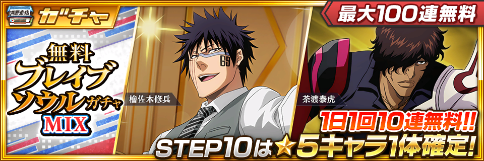 1日1回10連無料、期間中最大100連無料のガチャが登場!STEP10で★5キャラクターが1体確定で出現!