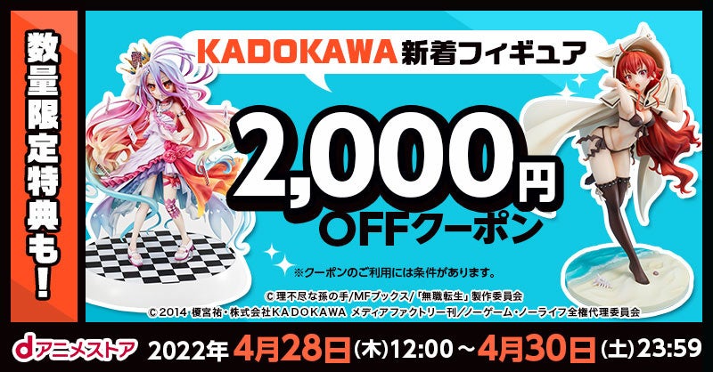春アニメ 見放題最速配信数No.1(※)アニメ見放題サイト「dアニメストア」( https://animestore.docomo.ne.jp/ )では、2022年4月28日~4月30日まで「KADOKAWA 新作フィギュア 2,000円OFFクーポン」を配布いたします。