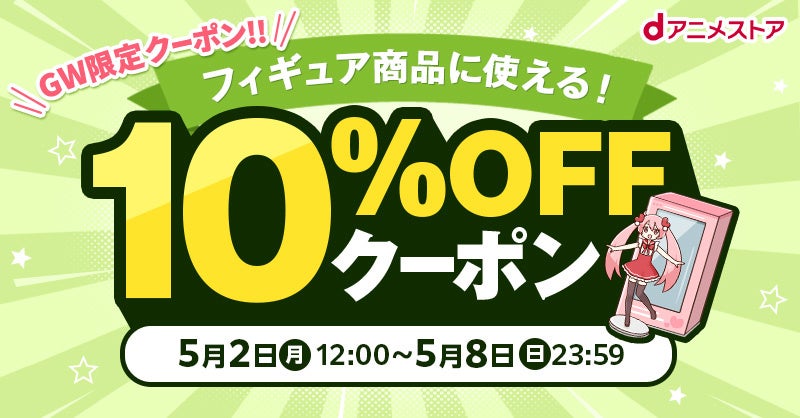 春アニメ 見放題最速配信数No.1(※)アニメ見放題サイト「dアニメストア」( https://animestore.docomo.ne.jp/ )では、2022年5月2日~5月8日まで「GWフィギュア限定10%OFFクーポン」を配布いたします。
