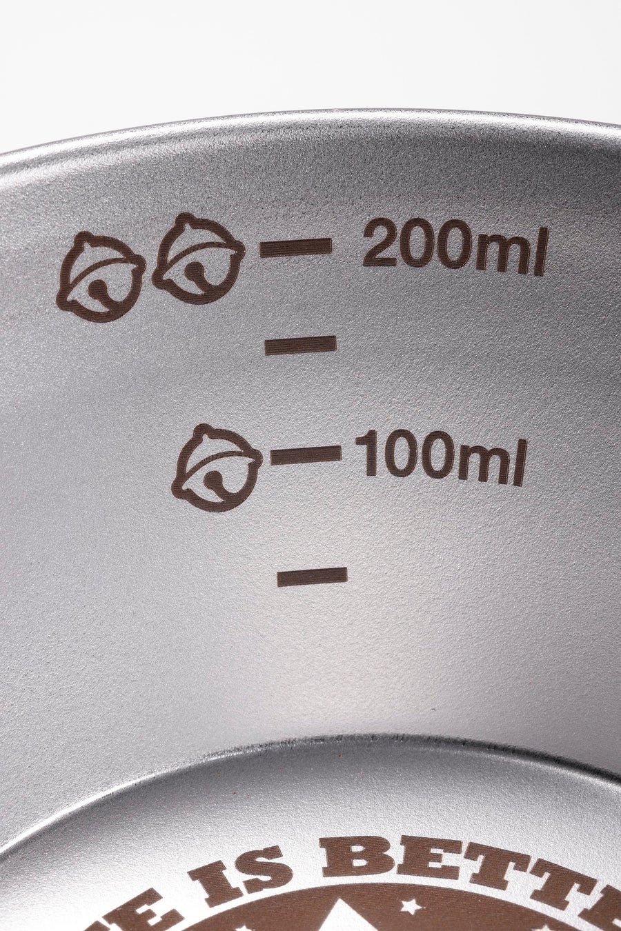 カップの内側には100㎖と200㎖の計量を示すメモリを、数字とともにドラえもんの鈴で表現。ユーモアと実用性を兼ね備えたデザインです。