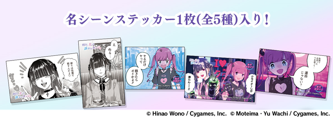 新登場の KleinerFeigling THE DOSE とマンガアプリ「サイコミ」で好評配信中の「明日、私は誰かのカノジョ」と「東京深夜少⼥」がコラボレーション!人気キャラクターの「ゆあてゃ」と「りあ」のかわいらしい両面パッケージで、作中の名シーンを切り取ったステッカーがランダムで 1 枚付いてくる!うち1枚は限定書き下ろし!Tシャツセットはゆあてゃが大きくプリントされた限定品です!この機会にぜひチェックしよう!