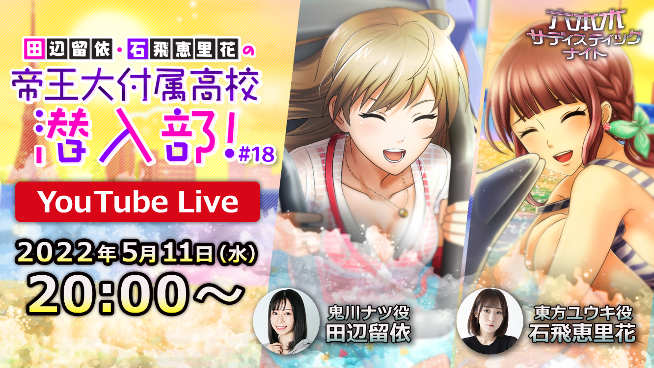 株式会社ボルテージ(本社:東京都渋谷区 代表取締役:津谷 祐司)は、現在配信中のカード型サスペンスアプリ「六本木サディスティックナイト」のYouTube LIVE「田辺留依・石飛恵里花の帝王大付属高校潜入部!#18」を5月11日(水)に生配信することをお知らせいたします。