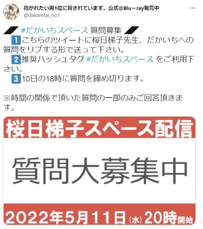 抱かれたい男1位に脅されています。公式Twitter(@dakaretai_no1)