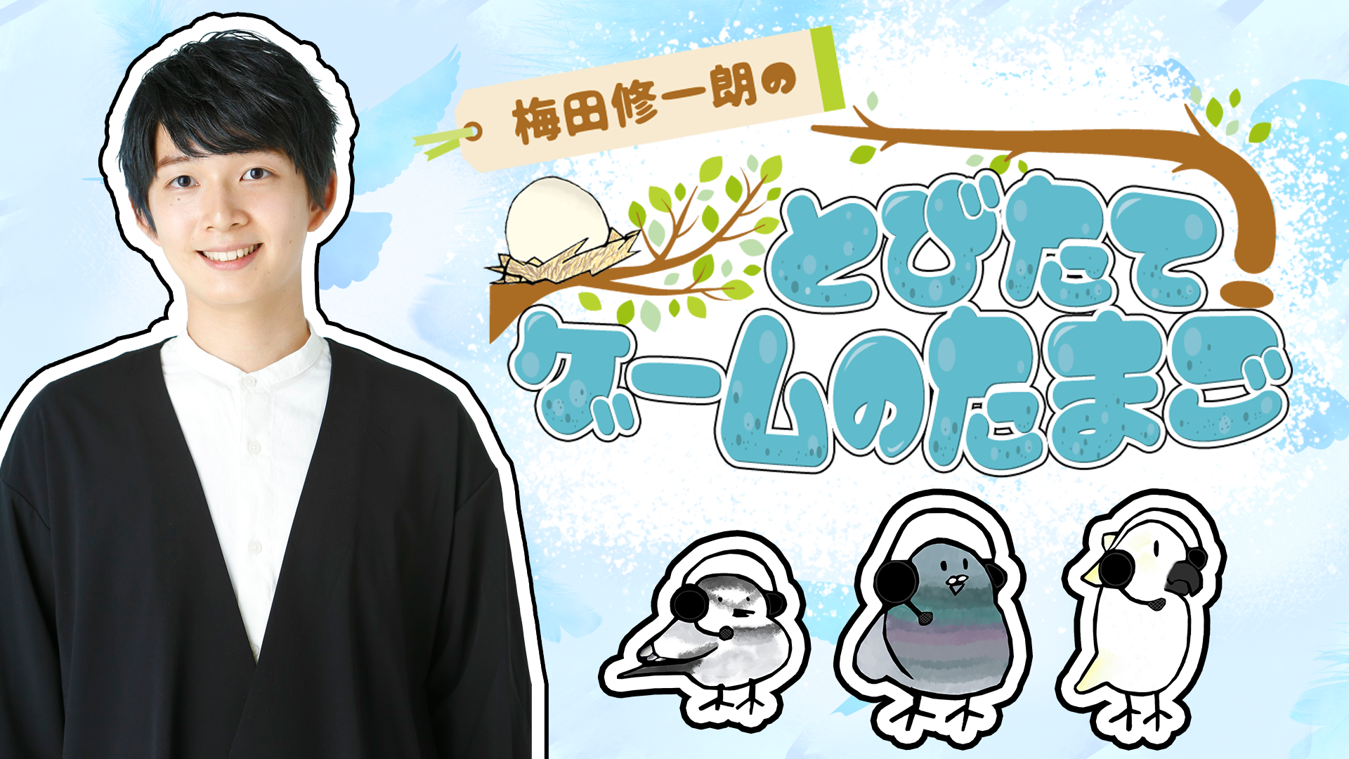 『梅田修一朗のとびたて!ゲームのたまご』は、新人声優の梅田修一朗さんが人気作からマニアックなものまで、さまざまなゲームを通じてファンの皆さんと交流する、月1回の生配信ゲームバラエティー番組です。また、ラーメン好きの梅田さんによる麺類“生”食レポコーナーや、番組セットを獲得するためのマニアックなクイズなど、ゲーム以外の要素も盛りだくさん!