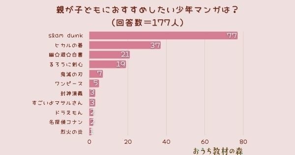 ARINA株式会社が運営する幼児、小学生の親御さん向けの教育メディア「おうち教材の森」(https://naki-blog.com/study/)は、日本全国の中学生以下のお子さんをお持ちの親御さんを対象に「親が子どもにおすすめしたい少年マンガは?」とアンケート調査を実施しました。その結果を公表します。