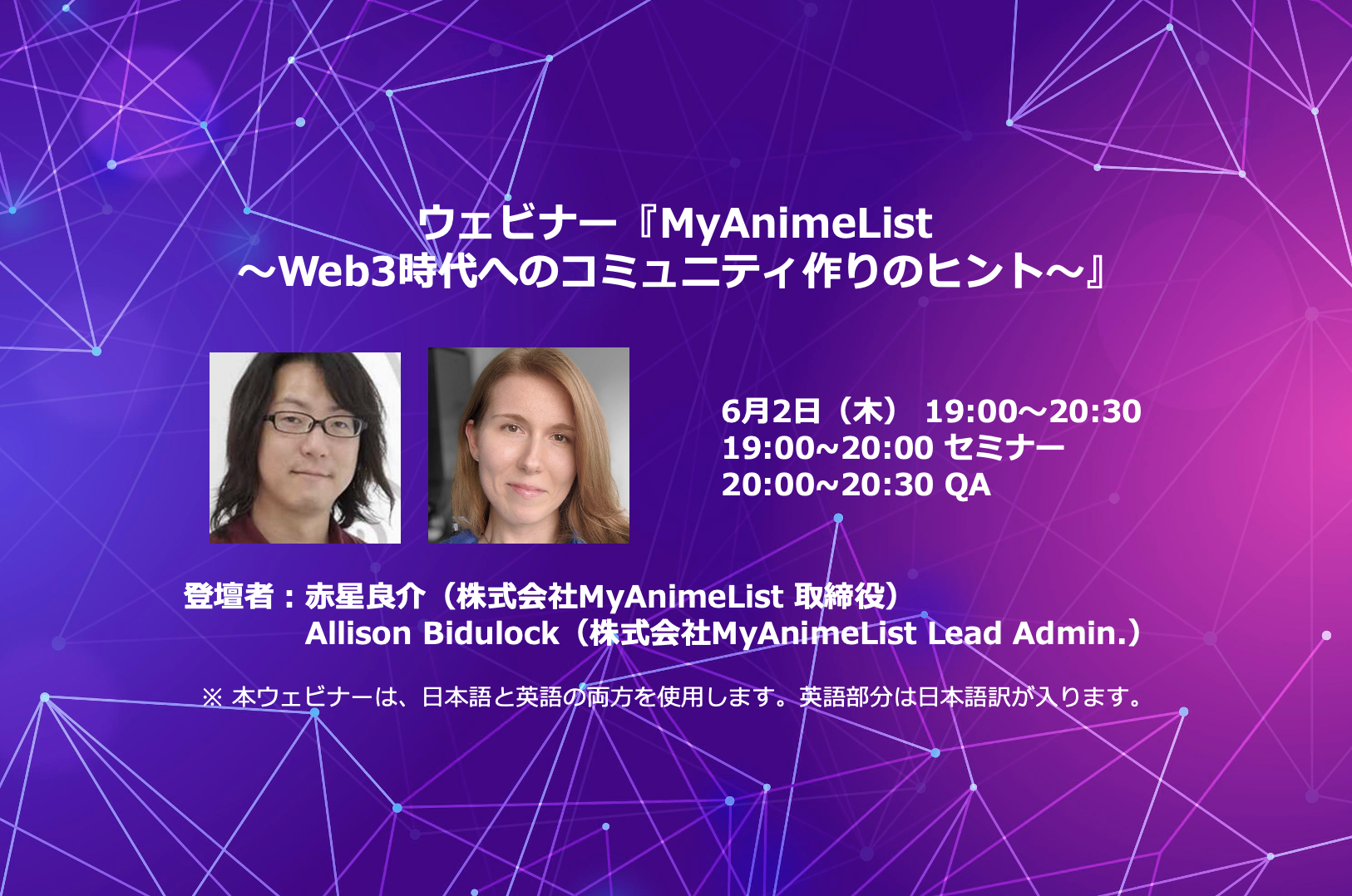 Web3、DAO、NFT、メタバースといった言葉を目にしない日がない昨今、年月による検証を経たMyAnimeListのユーザー自治の事例をご紹介することで、今後のビジネスへのヒントをお持ち帰りいただけることを確信しています。本イベントの最後には、MyAnimeListが持つ大いなる可能性とこれからの挑戦についてもお話しします。ご参加を心よりお待ちしております。
