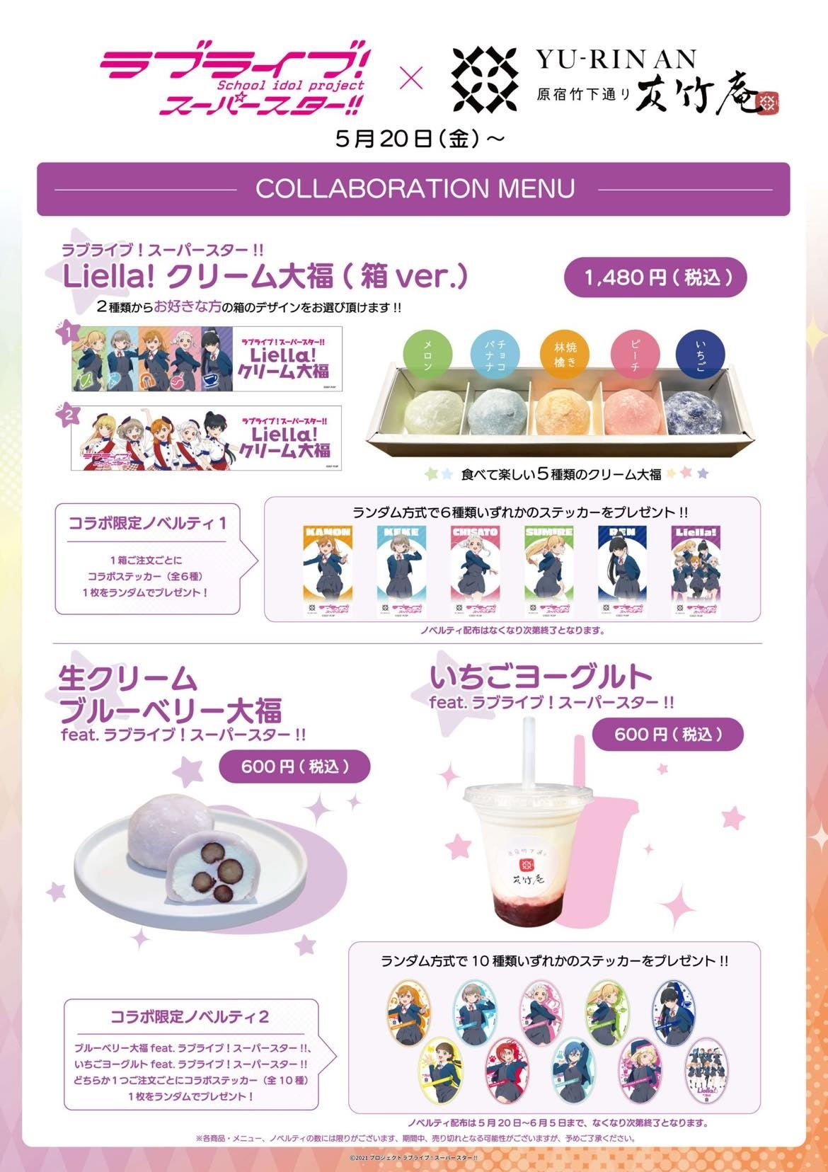 「YURINAN-原宿竹下通り友竹庵-」では「ラブライブ!スーパースター!!」をイメージした限定ステッカー(全6種・ランダム)付きラブライブ!スーパースター!! Liella! クリーム大福(箱ver.) 1,480円(税込)と、限定ステッカー(全10種・ランダム)付き生クリームブルーベリー大福 feat. ラブライブ!スーパースター!! 600円(税込)、いちごヨーグルト feat. ラブライブ!スーパースター!! 600円(税込)を販売いたします。
