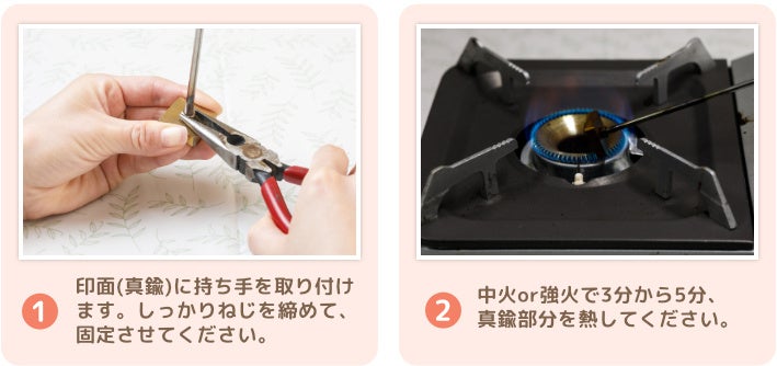 焼印部分は2.5×2.5センチの真鍮(しんちゅう)製。木製の持ち手付きとなります。