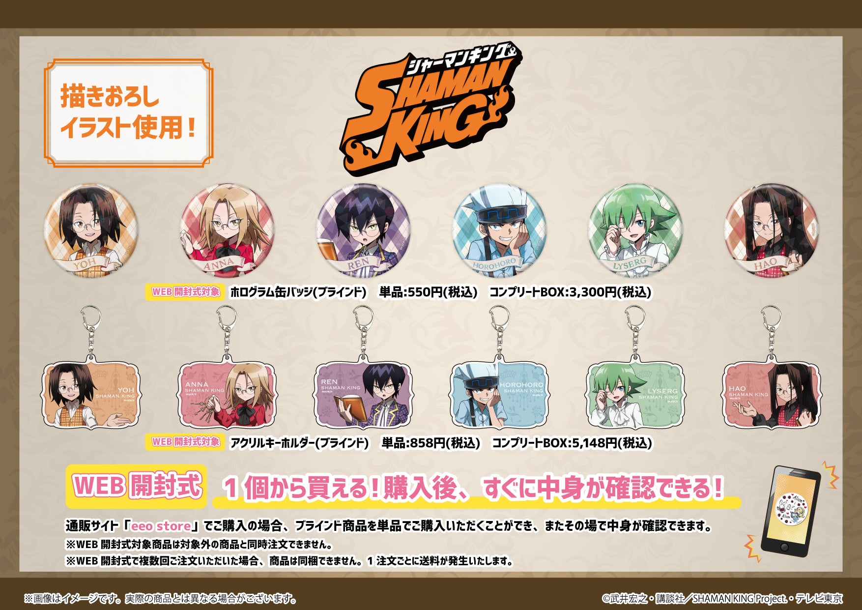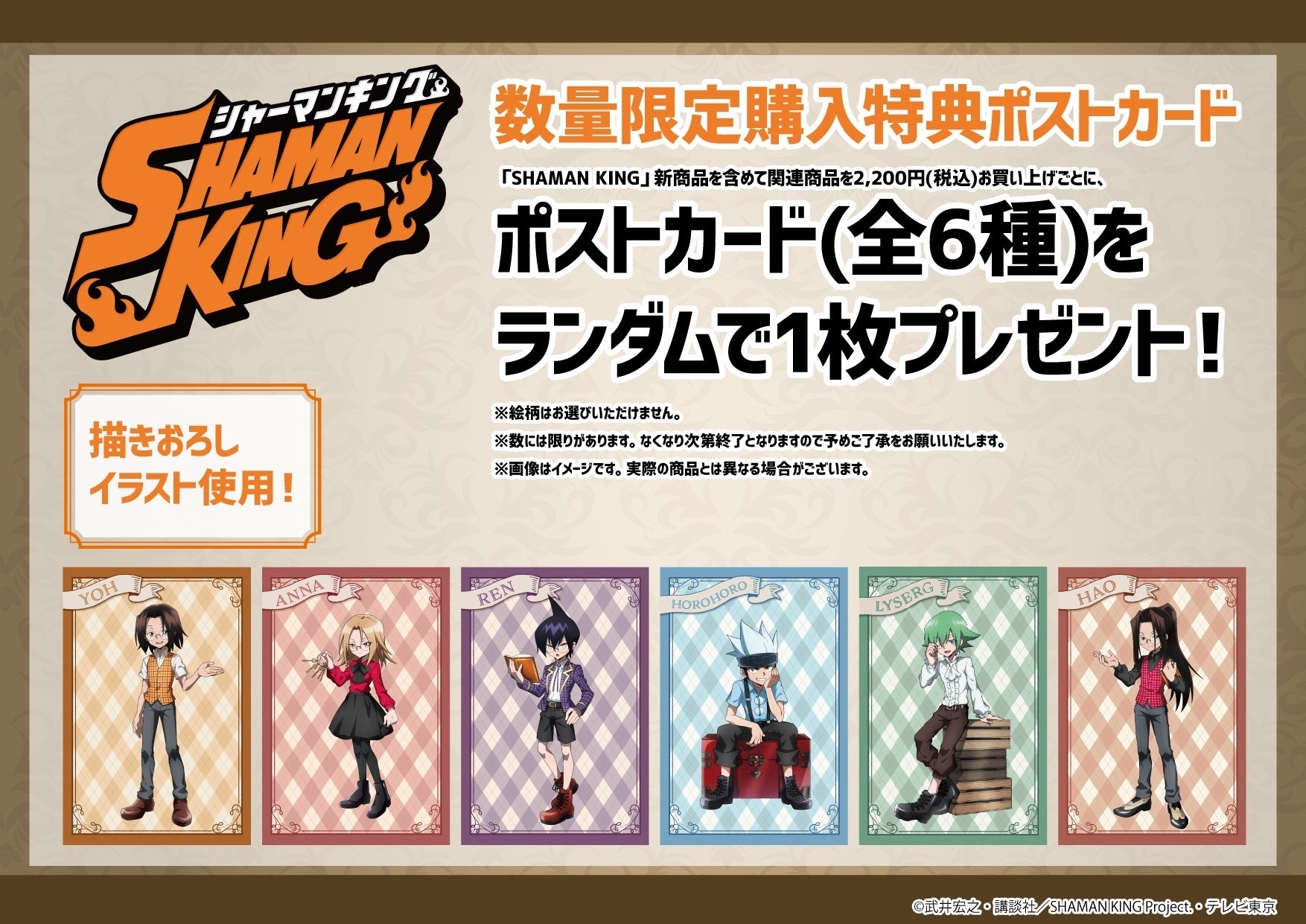 オンラインミュージアム開催にあわせてeeo StoreではTVアニメ「SHAMAN KING」の限定グッズをはじめ、たくさんの関連商品を販売しています。また、グッズを税込み2,200円以上ご購入の方には描き下ろしイラスト使用のポストカードの特典も。