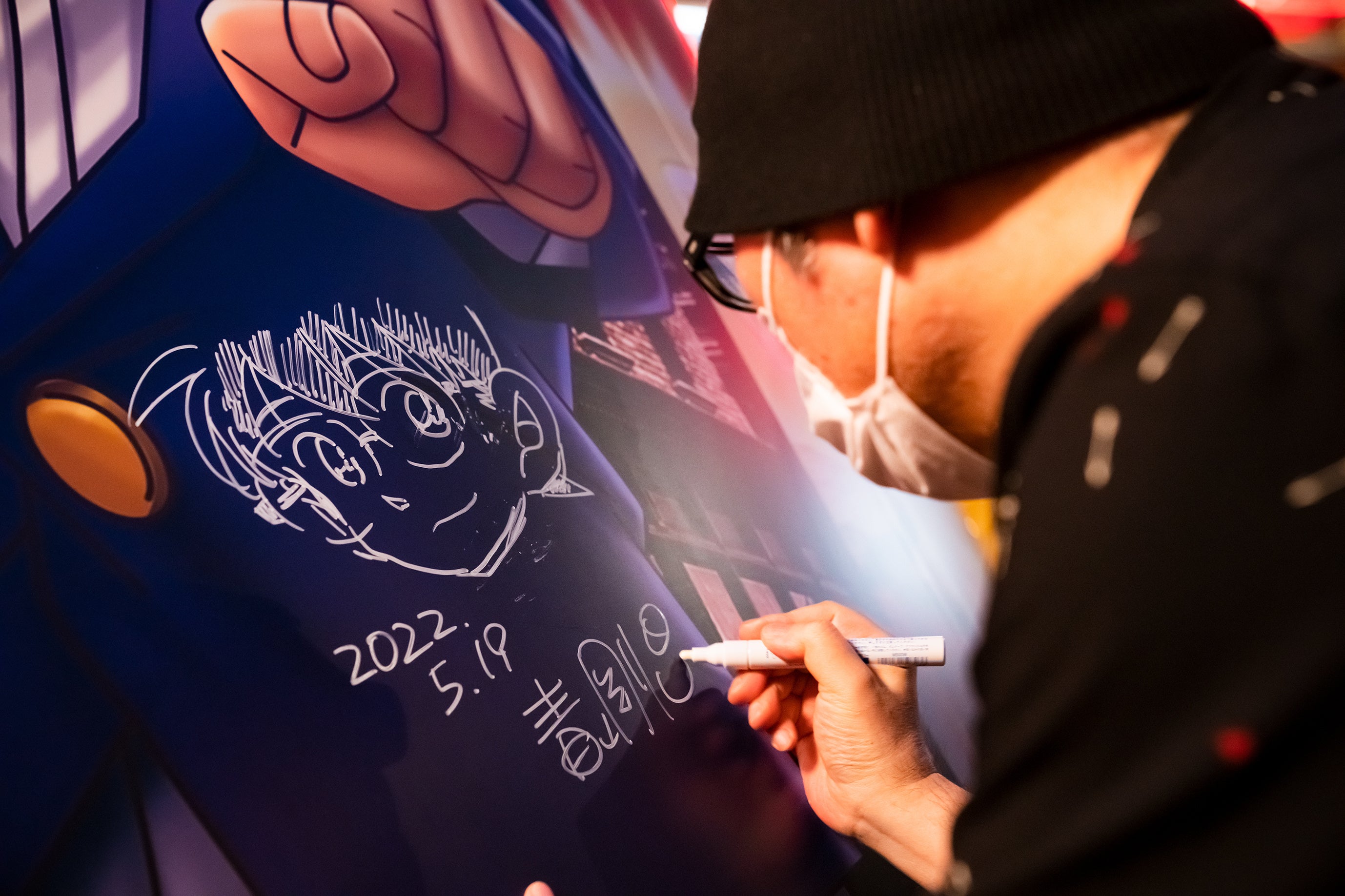 サプライズとして、青山氏はシネマ4-Dストアの店舗にラッピングされたコナンのビジュアルにサインとコナンを描かれました。また、喫茶ポアロを再現した『ロンバーズ・ランディング』のテラスにもサインと、あの登場人物を描かれています。是非、パーク内で探してみてください。