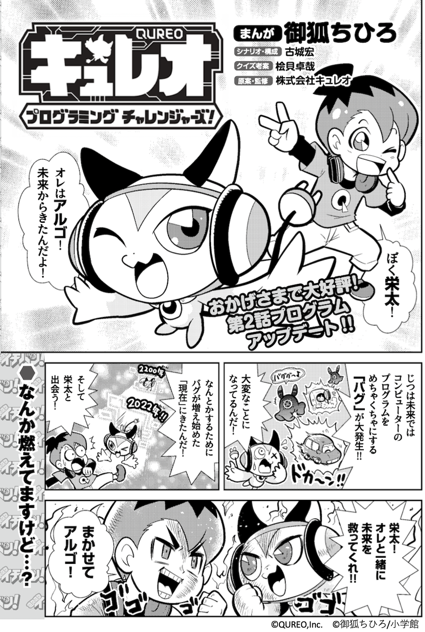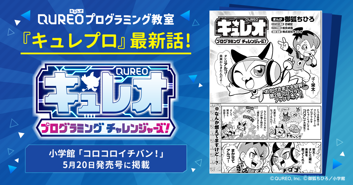 株式会社CA Tech Kidsと株式会社スプリックスとの合弁会社で、プログラミング教材の開発・運営・販売事業を行う株式会社キュレオ(本社:東京都渋谷区、代表取締役社長:上野朝大)は、運営する子ども向けプログラミング教室「QUREO(キュレオ)プログラミング教室」 https://qureo.jp/class が全面監修するプログラミング学習マンガ『キュレオ プログラミングチャレンジャーズ!(通称:キュレプロ)』の最新話の内容をお知らせいたします。最新話が掲載される、小学館「コロコロイチバン!」5月20日発売号の本誌ページの一部も公開いたします。