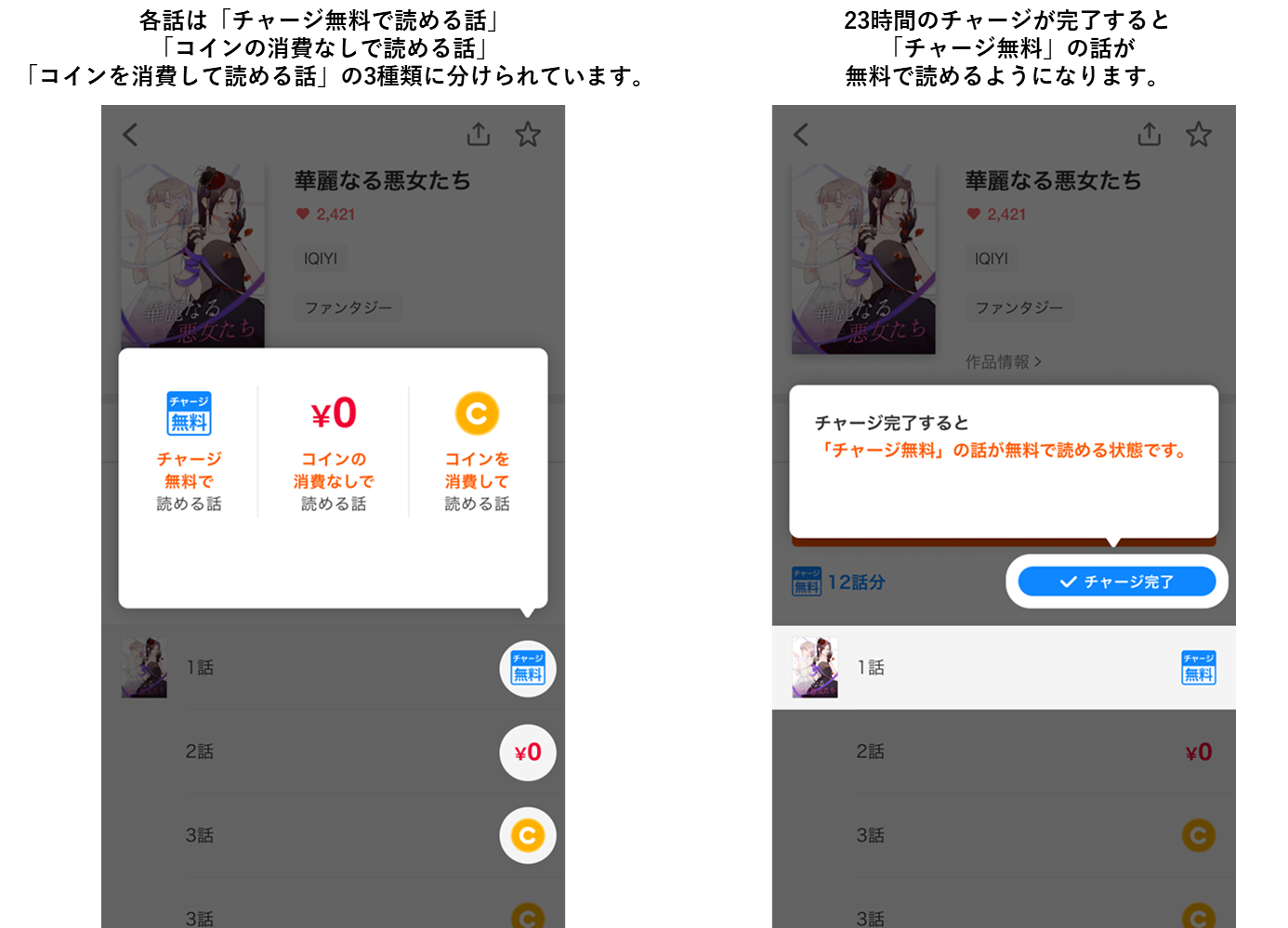 ※2…作品によって、全話「無料チャージ」で読めるものと、途中話より有料に切り替わるものがあります。
