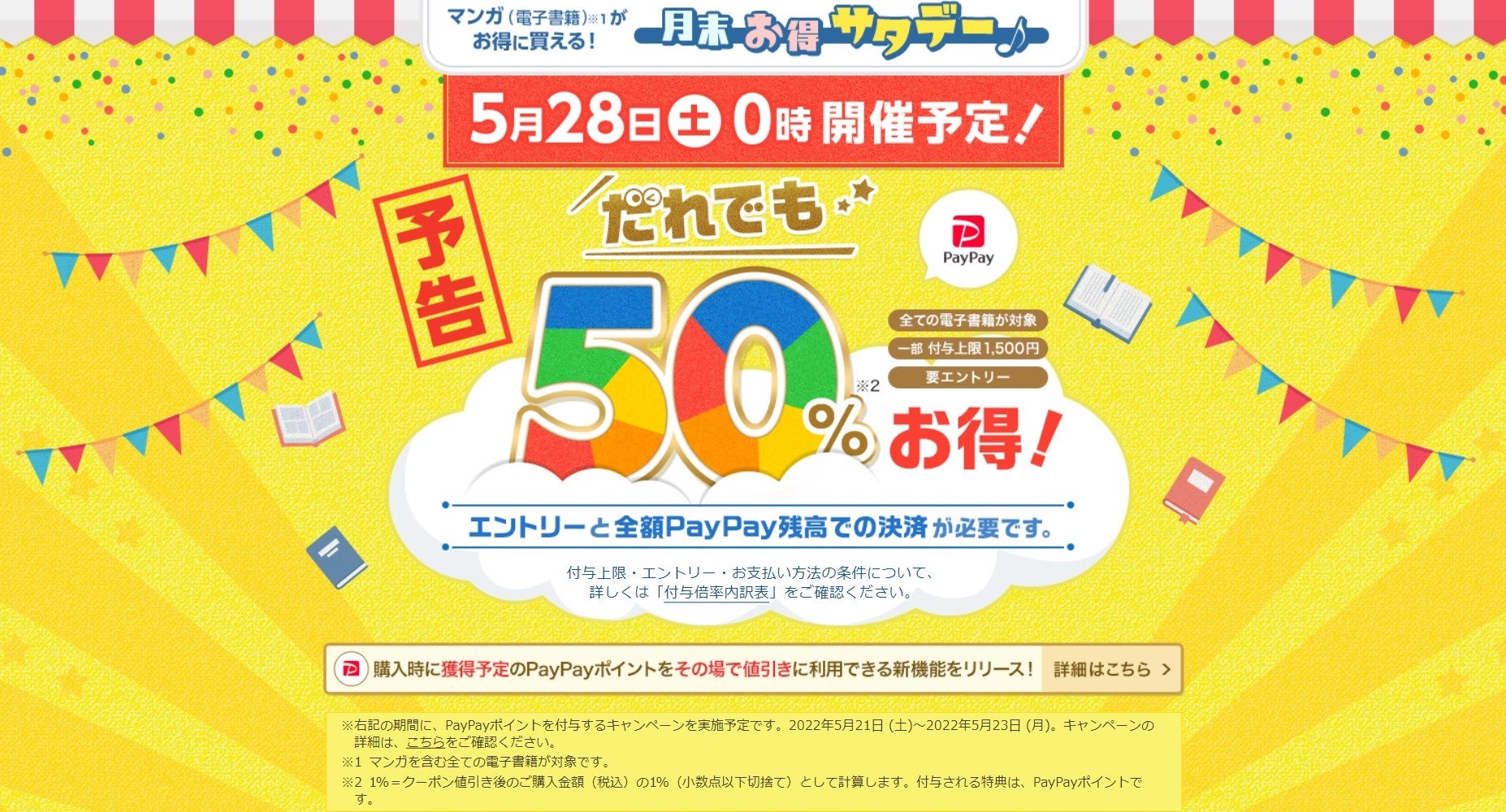 5月28日(土)に限り「PayPay残高」で電子書籍を購入すると、誰でも50%お得になるキャンペーンです。この機会に、気になっていた作品をぜひお楽しみください。