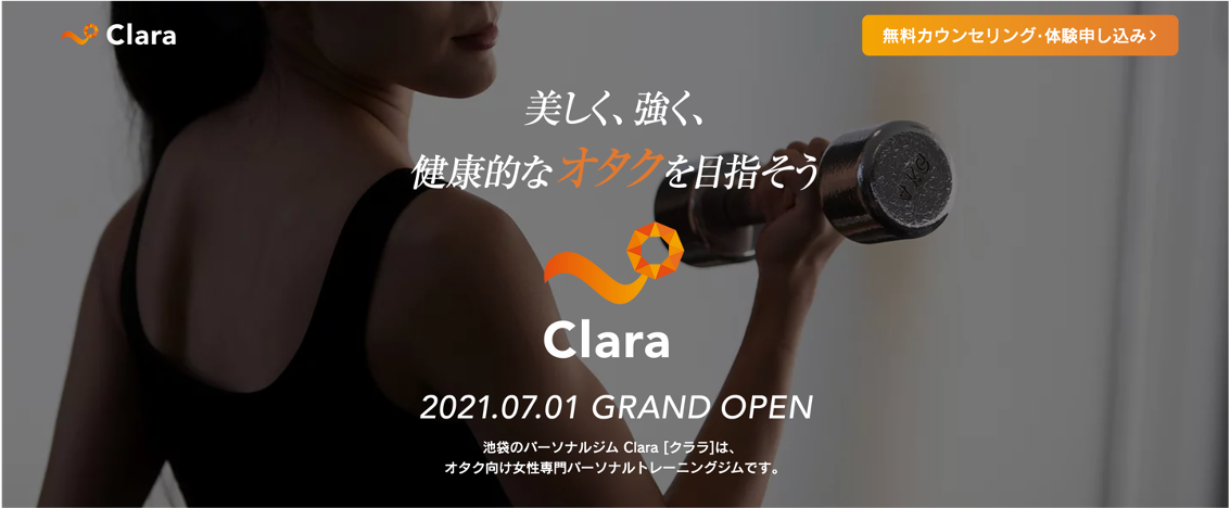 「Clara(クララ)」は、オタク女性の身体のお悩みに寄り添い、 美と健康をお届けするというミッションを掲げる、オタク向け女性専門パーソナルトレーニングジムです。