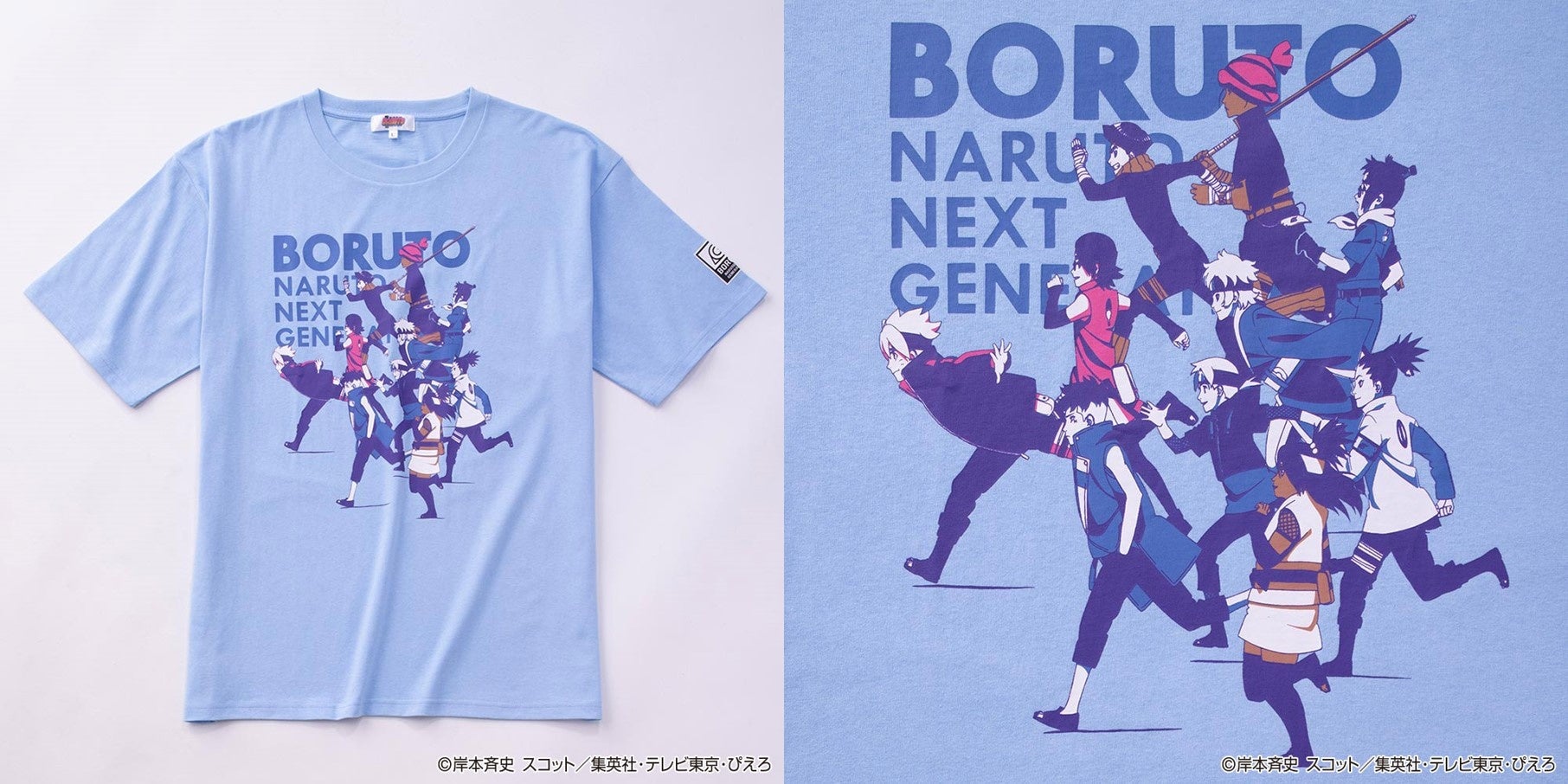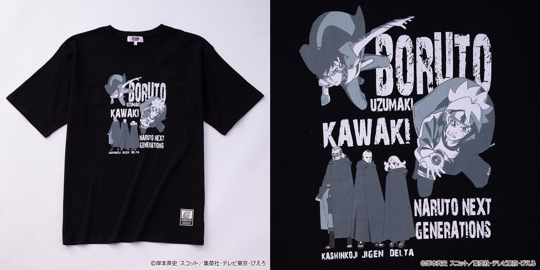 主人公・うずまきボルトをはじめとするキャラクターたちの動きあるシーンと、木ノ葉マークをワンポイントでプリントしたTシャツです。