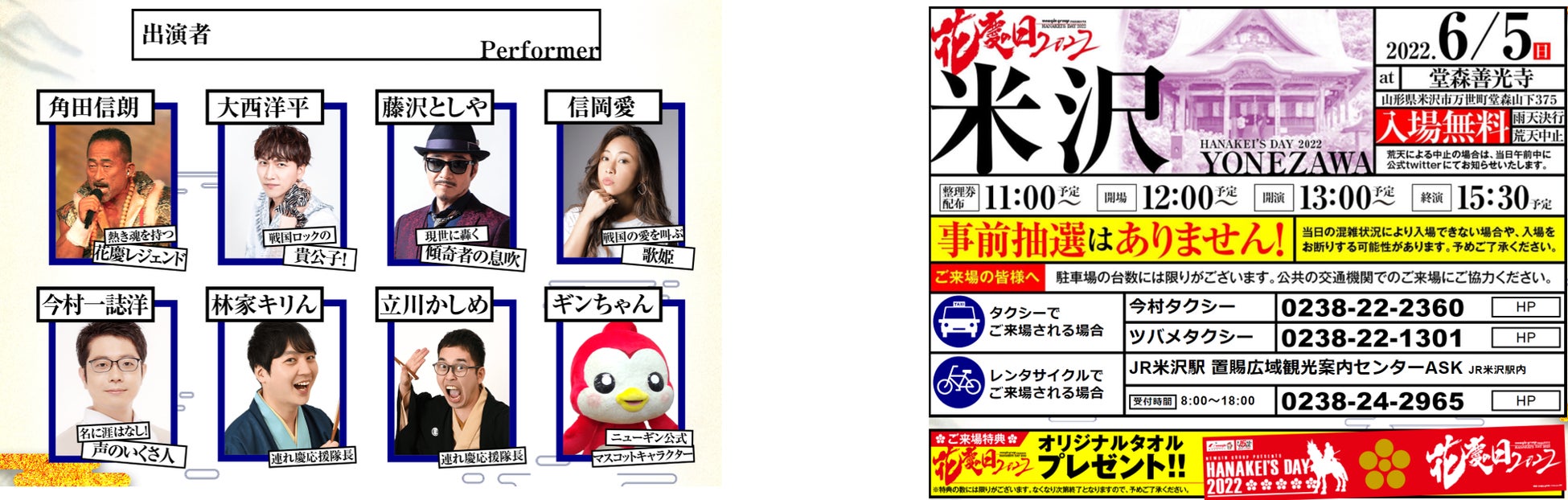本年度は「パチンコ・パチスロ花の慶次シリーズ15周年」というメモリアルイヤーとなりますので、前田慶次が生涯を閉じた地、山形県米沢市を皮切りに「花慶の日2022」をスタートさせて頂き、原作の認知向上、パチンコ・パチスロ「花の慶次」の稼動支援を目的として実施させて頂きます。
