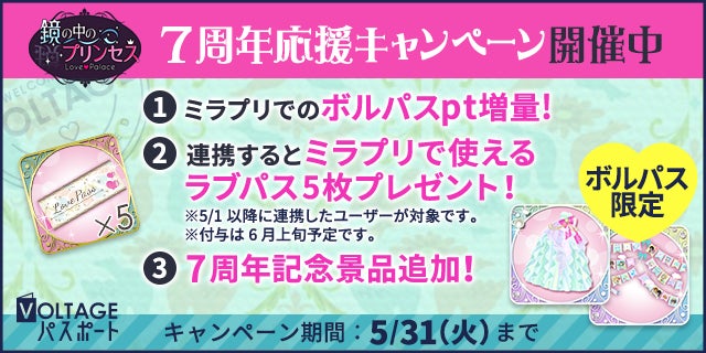 株式会社ボルテージ(本社:東京都渋谷区 代表取締役:津谷 祐司)は、提供中のボル恋タイトル「鏡の中のプリンセスLove Palace」(以下、「ミラプリLP」)が5月に配信7周年を迎えたことを記念し、記念企画を実施することをお知らせいたします。