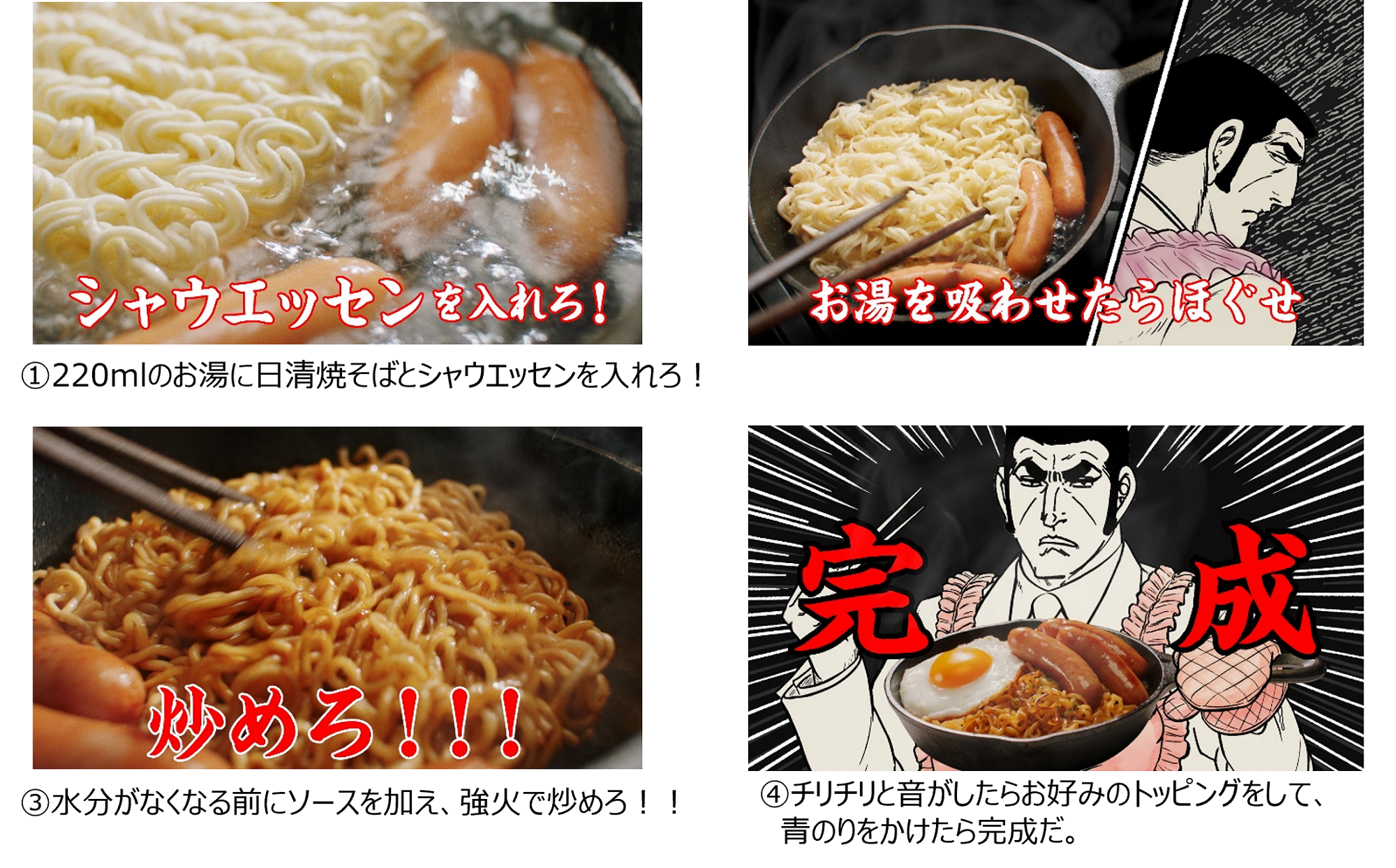 ハードな音楽で緊迫感が溢れる中、その調理方法はいたって簡単・シンプルで、「日清焼そばを作るときに、シャウエッセンを入れるだけ」。