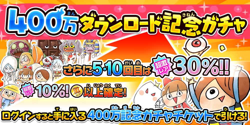 激レア以上確定の特別ガチャ「400万ダウンロード記念ガチャ」を開催いたします。