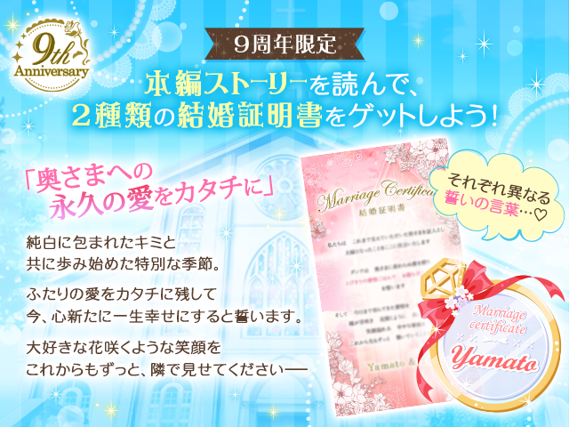 開催期間内に各本編ストーリーの「SuperHappyEnd」をクリアすると、イラストとアバター2種類の結婚証明書が手に入ります。