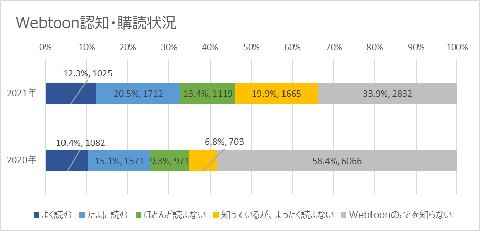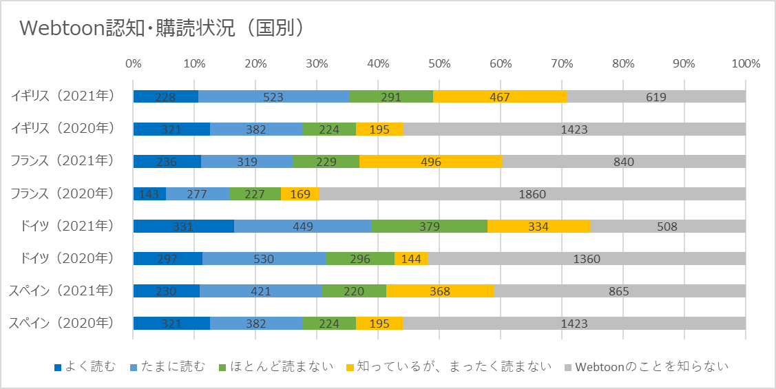 昨年は、スマートフォンで縦向きにスクロールして読み進めるWebtoonの認知度も高まりました。 2020年には、回答者の58.4%がWebtoonについて聞いたことがないと回答しましたが、2021年は33.9%に低下しました。特にドイツでは認知度が高く、全回答者の74.6%がWebtoonを知っていると回答しました(グラフ4)。