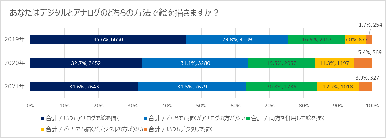 2019年から2020年にかけて制作にデジタル機材を活用する人々が大幅に増加し、54.4%から67.3%へと12.9ポイント増加しました(グラフ1)。これは世界的な新型コロナウィルスの流行により、人々が屋内で行える新しい趣味としてデジタル制作を取り入れた結果と推測されます。2021年の調査でも68.4%のクリエイターがデジタルを活用していると回答しており、デジタルの活用は2020年と同様のレベルで維持されていることがわかりました。