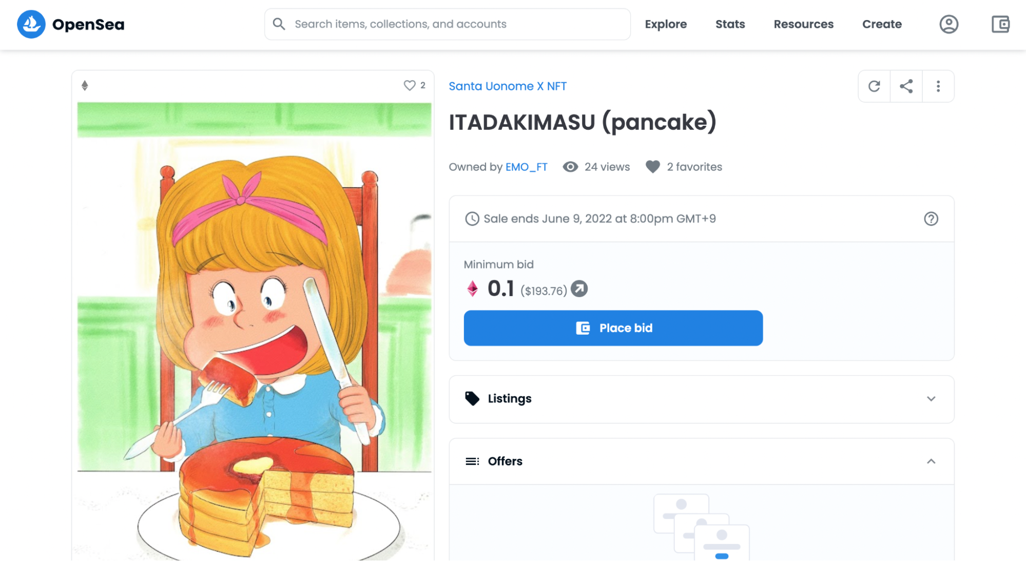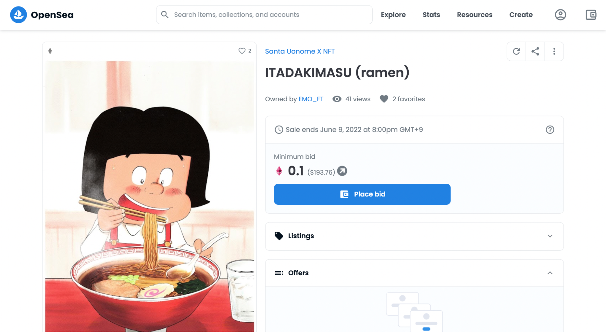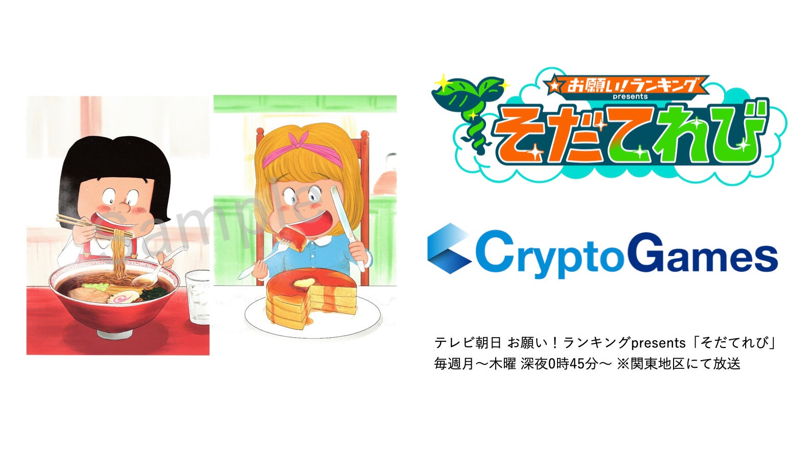 ブロックチェーンゲーム、NFTサービスの開発を⾏う、CryptoGames株式会社(東京都渋⾕区、代表取締役:⼩澤 孝太)は、テレビ朝⽇で放送中の新番組 お願い!ランキングpresents「そだてれび」内の企画である「エモエフティー やってみた!」と共同で、NFTマーケットプレイス「OpenSea」における漫画家・魚乃目 三太先⽣の書き下ろし作品「ITADAKIMASU (ramen)」 「ITADAKIMASU (pancake) 」のNFTアートの販売⽀援を実施したことをお知らせいたします。