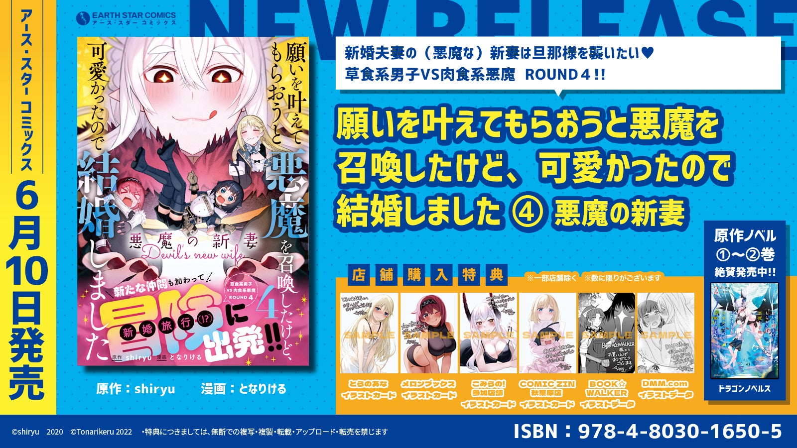 現在コミック アース・スターで掲載している人気作品『願いを叶えてもらおうと悪魔を召喚したけど、可愛かったので結婚しました〜悪魔の新妻〜』コミックス第4巻を6月10日(金)に発売いたします。
