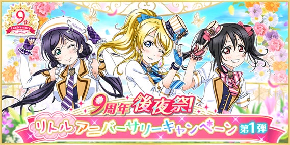 株式会社ブシロード(本社:東京都中野区、代表取締役社長:橋本義賢)は、KLab株式会社(本社:東京都港区、代表取締役社長:森田英克)と共同開発いたしましたスマートフォン向けアプリ『ラブライブ!スクールアイドルフェスティバル』(以下、スクフェス) において9周年後夜祭!リトルアニバーサリーキャンペーン 第1弾の開催をお知らせいたします。是非貴社の媒体にてお取り扱い頂きますようお願い申し上げます。