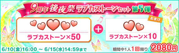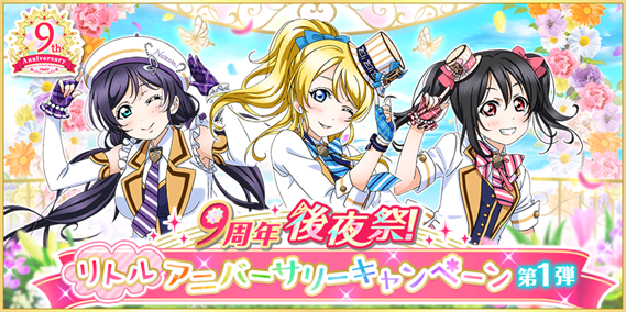 株式会社ブシロード(本社:東京都中野区、代表取締役社長:橋本義賢)は、KLab株式会社(本社:東京都港区、代表取締役社長:森田英克)と共同開発いたしましたスマートフォン向けアプリ『ラブライブ!スクールアイドルフェスティバル』(以下、スクフェス) において9周年後夜祭!リトルアニバーサリーキャンペーン 第1弾の開催をお知らせいたします。是非貴社の媒体にてお取り扱い頂きますようお願い申し上げます。