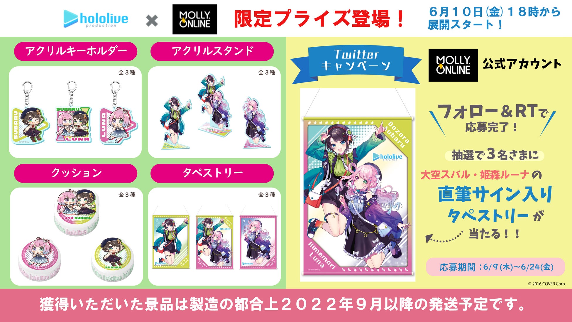 ホロライブ×「MOLLY.ONLINE」コラボ第十弾の展開を記念し、モーリーオンライン公式Twitterではフォロー&リツイートで「大空スバル」、「姫森ルーナ」のサイン入りペアイラストタペストリー」が3名さまに当たるTwitterキャンペーンを開始いたします。