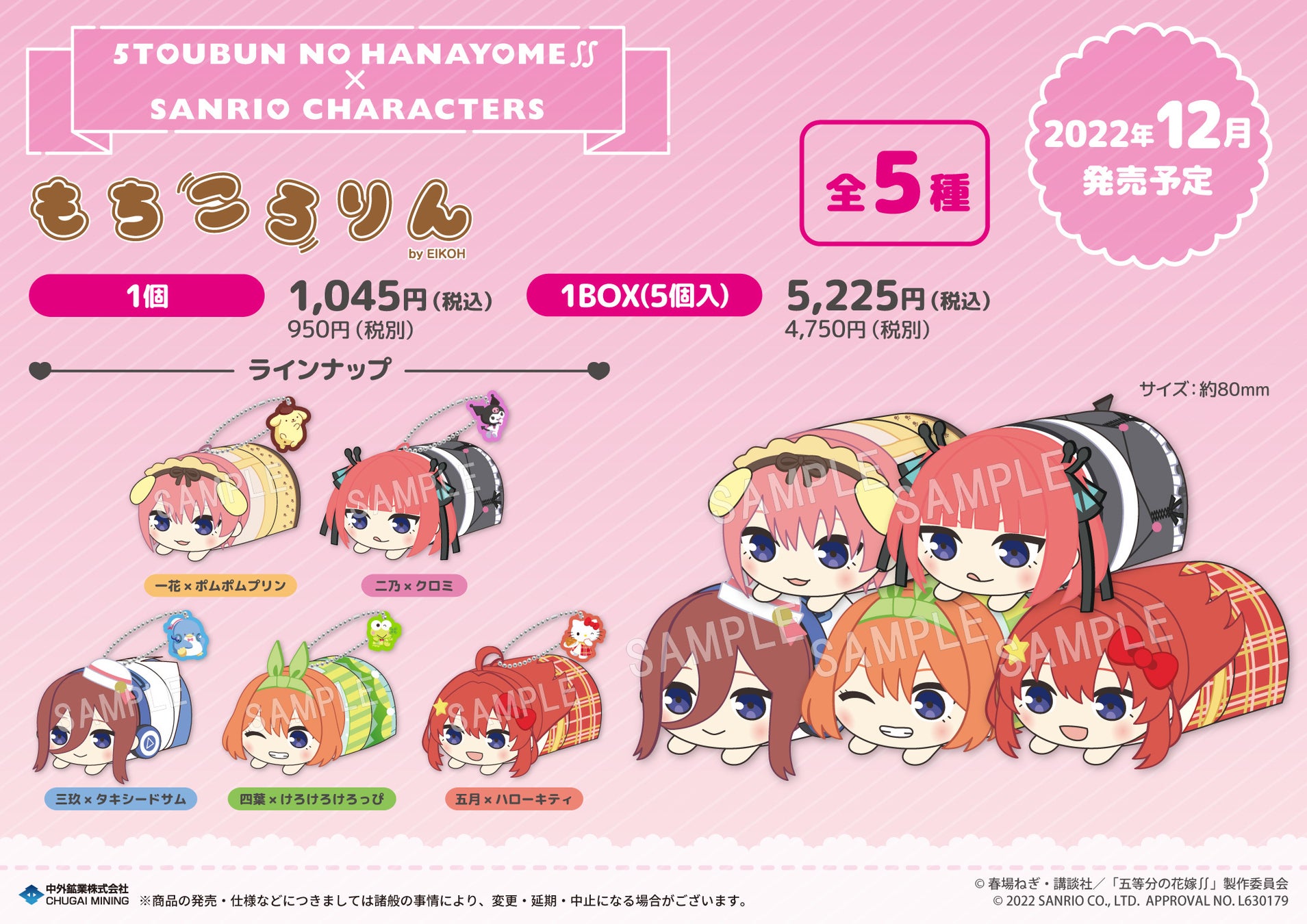 キャラクターグッズの商品企画・製作・販売を行う中外鉱業株式会社コンテンツ部は、TVアニメ『五等分の花嫁∬』より「もちころりん ぬいぐるみマスコット」サンリオキャラクターズコラボバージョンの販売を発表いたします。2022年12月発売予定となります。