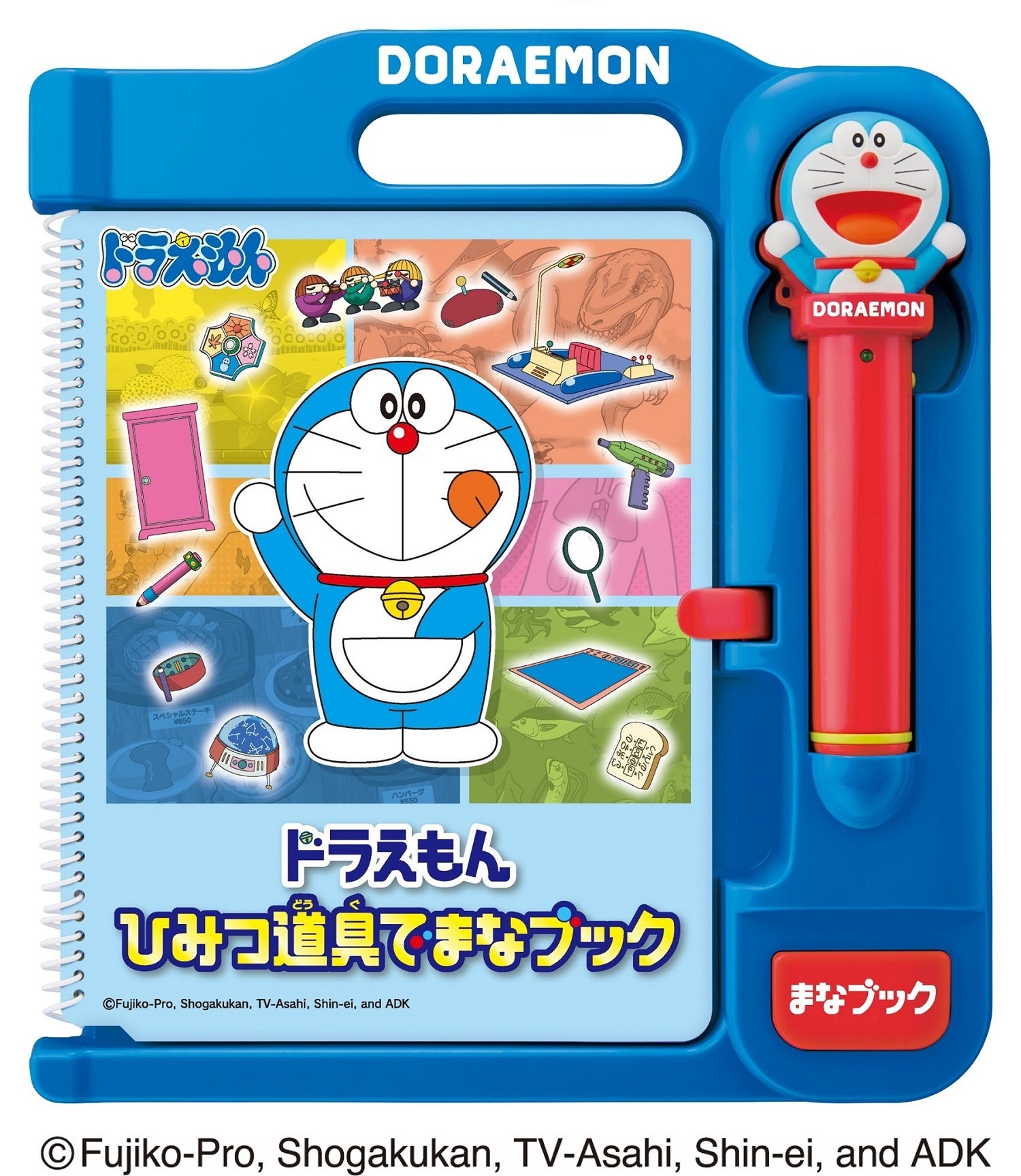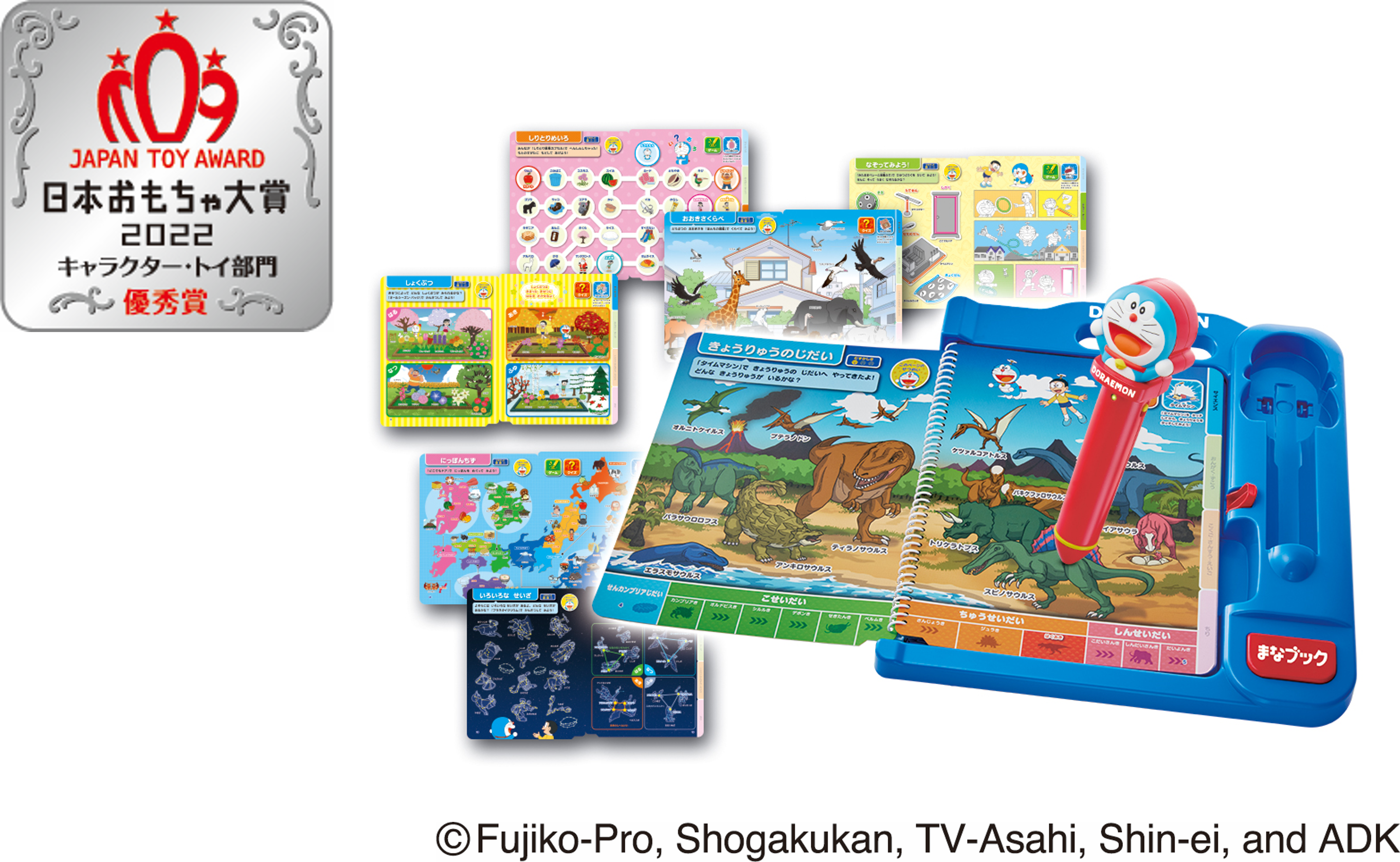 キャラクターIPを題材にした玩具が選ばれる「キャラクター・トイ部門」で優秀賞に選ばれた「ドラえもん ひみつ道具でまなブック」は、付属のペンで絵本の絵をタッチすることで、プログラムされたおしゃべりや効果音が鳴る機能が搭載されおり、おしゃべりは全て、「ドラえもん」や「のび太」などキャラクターの音声を使用しています。また、英語はネイティブスピーカーの声を使用しており、本格的な英語の発音に触れることができます。さらに「幼児教室」としての実績とノウハウをもつ、小学館の幼児教室『ドラキッズ』が、学習要素に関する監修を行っています。3才から7才のお子さまを対象とした恐竜や動物、太陽系や地球、楽器演奏やなぞり描き、漢字や数字、英語など、21種類もの楽しく遊んで学べる充実したコンテンツテーマが搭載された商品となっています。付属のペンで「ひみつ道具」のマークをタッチすると、セリフや遊びが変わり、ドラキッズ監修の詳しい説明を聞く事もできます。
