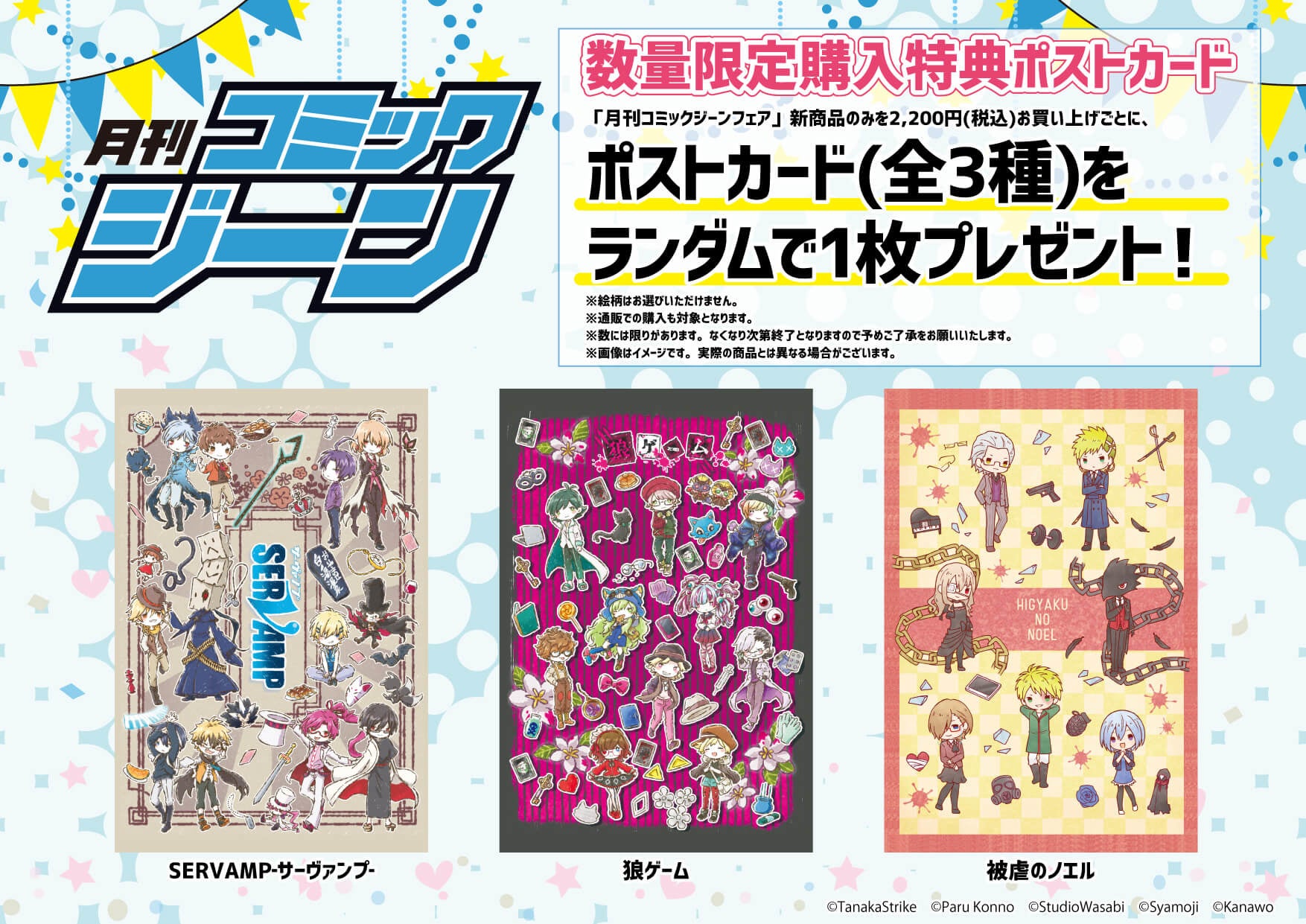 『月刊コミックジーンフェア』で登場した新商品のみを税込み2200円以上ご購入ごとにポストカードをプレゼント!