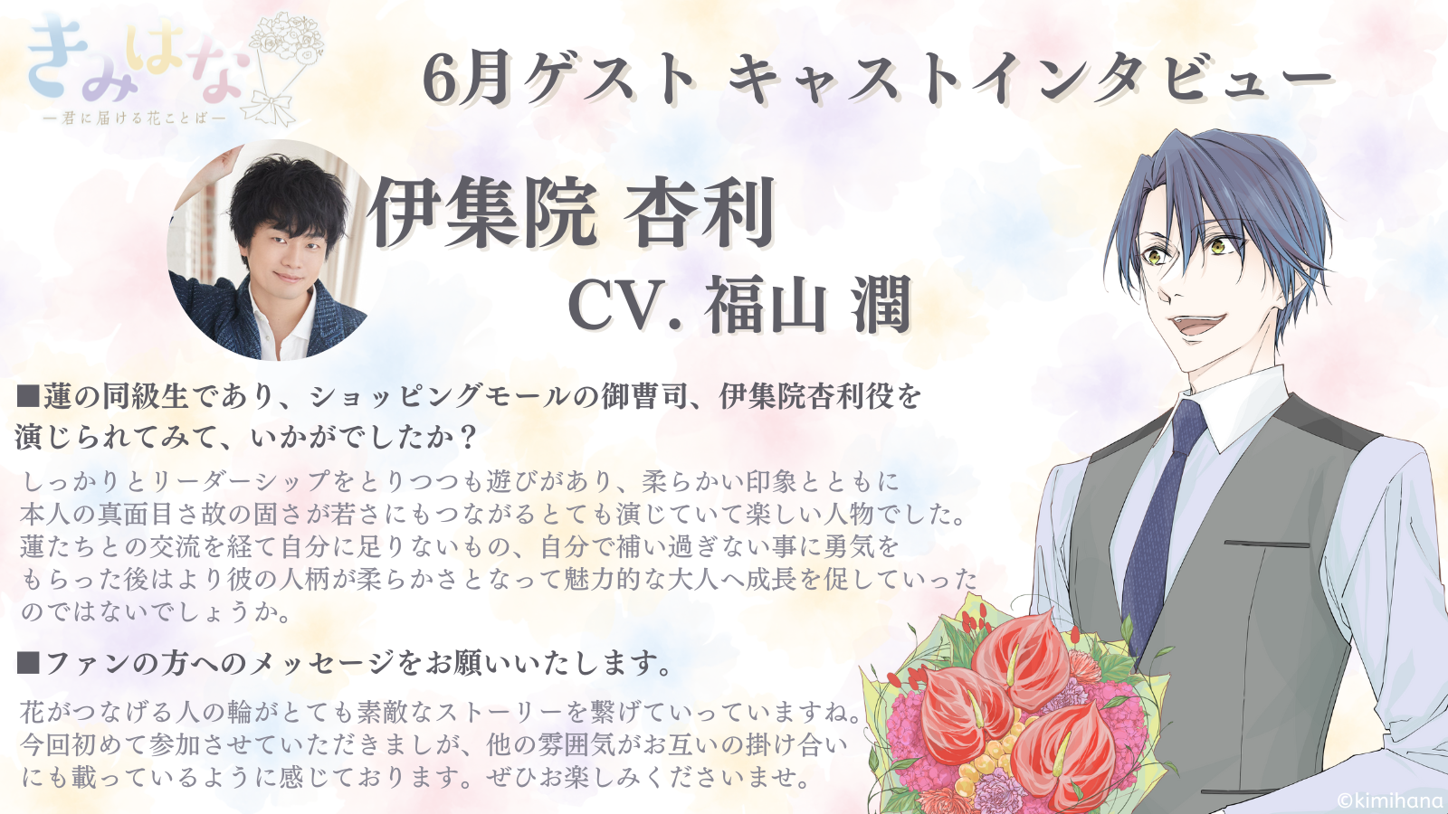 株式会社ムービックは、毎月ご自宅にオリジナル音声ドラマとミニブーケをお届けする新しいサブスクリプションサービス【きみはな~君に届ける花ことば~】のサブスク6月分音声ドラマに登場するゲストキャラクター及び声優キャストが決定!