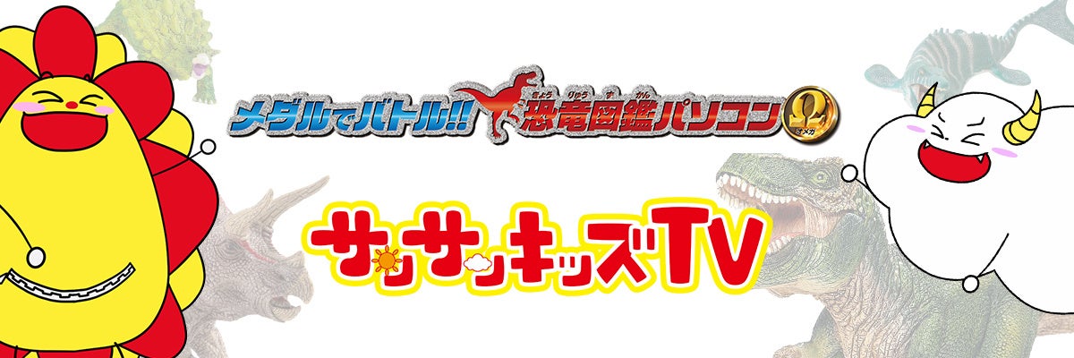 メダルで恐竜を召喚!8種類の恐竜でバトルに挑みながら、勉強も遊びもこれ1台で楽しめる「メダルでバトル!! 恐竜図鑑パソコンΩ」と、チャンネル登録103万人・総再生数18億回を超える人気ファミリー向けYouTuber「サンサンキッズTV」がタイアップコラボを開始しました。