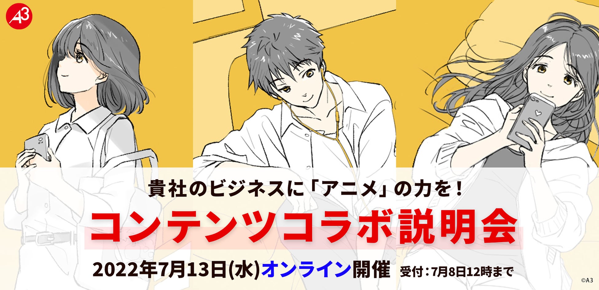 株式会社A3(東京都豊島区、代表取締役社長:小澤 隆史)は、埼玉県の企業様を対象に、アニメ・ゲームコンテンツを自社のビジネスに活用するノウハウのご紹介を目的とした『コンテンツコラボ説明会』を実施いたします。