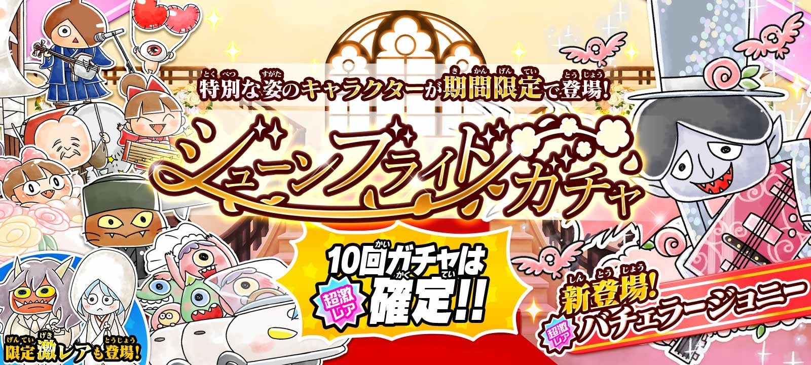 ゆるゲ大戦争製作委員会(配信・企画:東映アニメーション株式会社、企画・開発・運営:ポノス株式会社)は、人気アニメ『ゲゲゲの鬼太郎』を題材としたスマートフォン向けゲーム『ゆる~いゲゲゲの鬼太郎 妖怪ドタバタ大戦争』(略称:ゆるゲゲ)におきまして、「バチェラージョニー」が初登場する「ジューンブライドガチャ」および、豪華報酬が手に入る限定イベントの開催をお知らせいたします。
