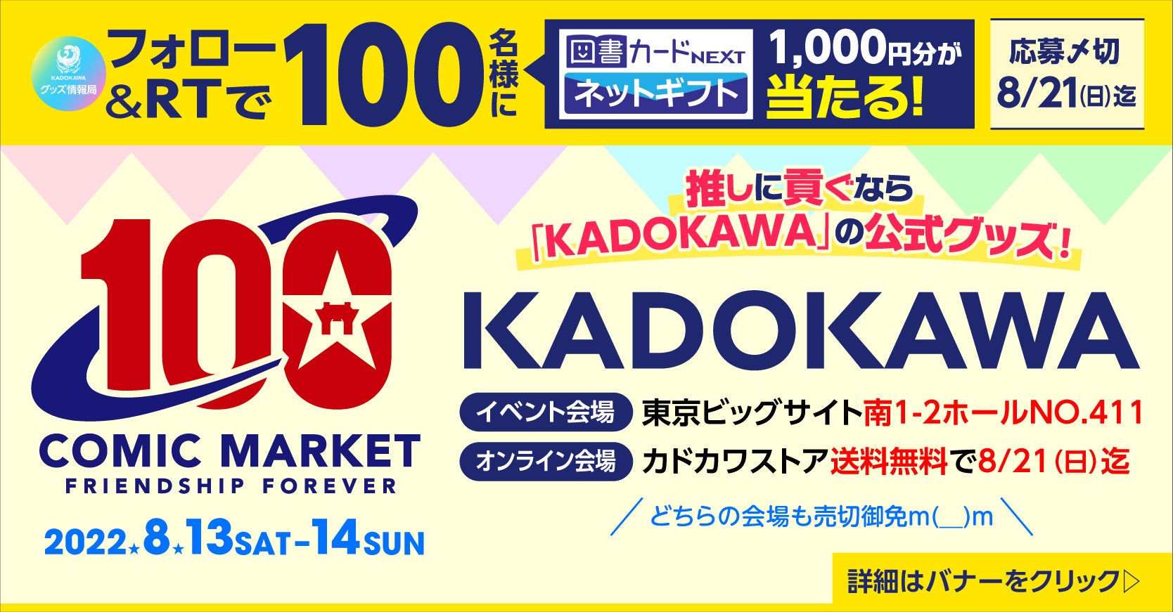 | <オンライン販売情報> 名称:C100 KADOKAWAブース オンライン in カドカワストア 受注期間:2022年6月17日(金)17時~2022年8月21日(日)23時59分 商品お届け日:2022年9月中旬より順次出荷予定 https://store.kadokawa.co.jp/shop/e/ec100000/ ※期間中、オンライン受注上限に達した商品はカドカワストア分のみ売切れ(受注終了)となります。 |