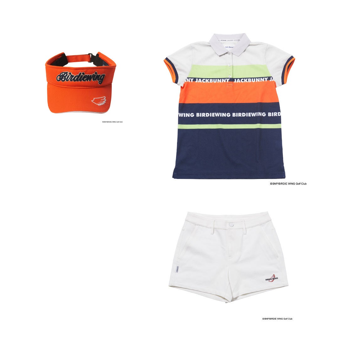 大胆なパネルボーダー柄で表現したポロシャツはフロントにタイポグラフィなJACK BUNNY×BIRDIE WINGのコラボロゴを配し、発色の良いスポーティなデザイン。