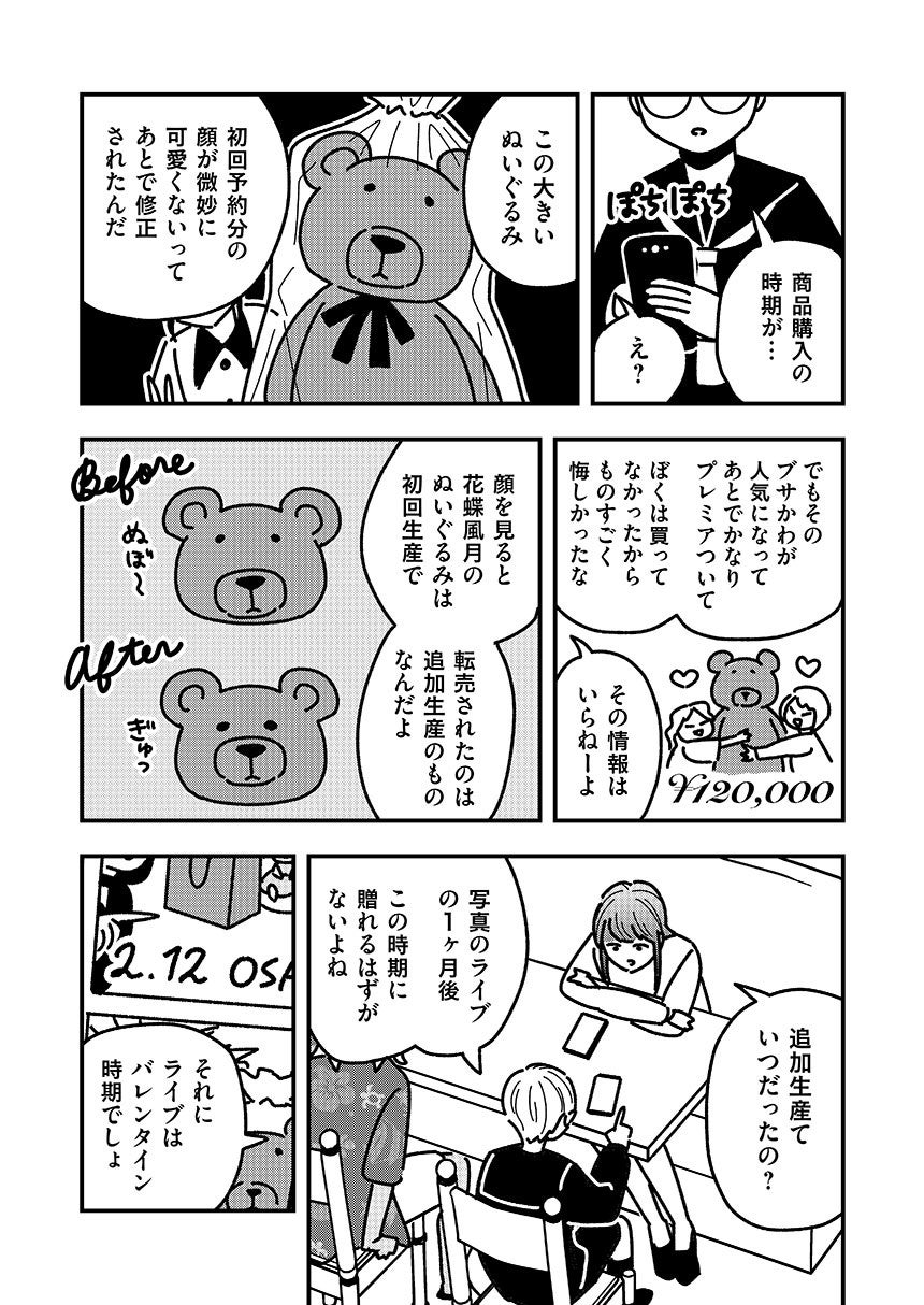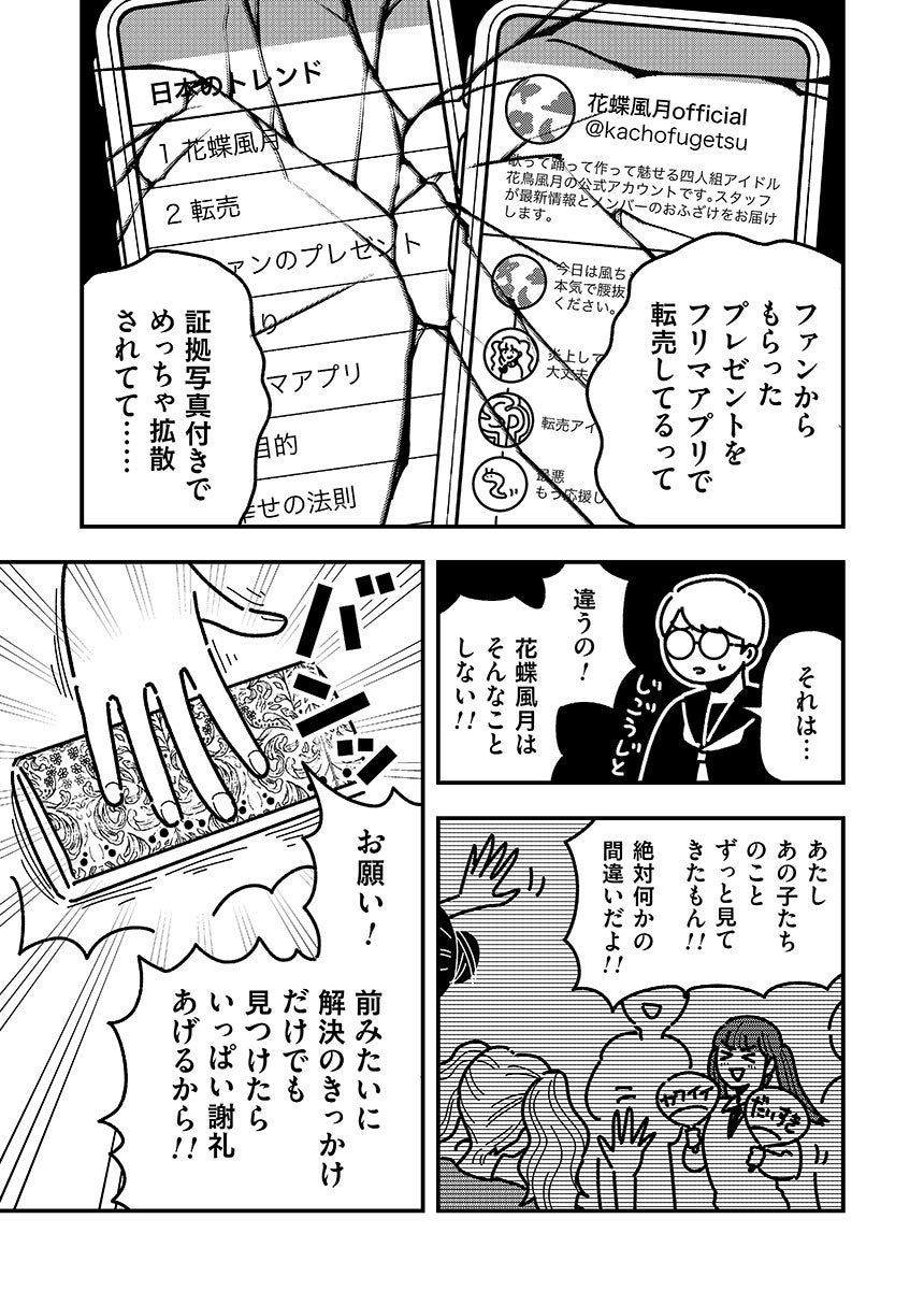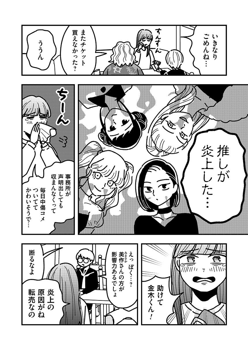 日々転売にいそしむ小学生の金木と彼に雇われたお気楽ニートの大友。ある日ふたりは転売をきっかけに知り合ったインフルエンサーの美作に呼び出される。号泣しながら現れた彼女に話を聞くと、どうやら彼女の「推し」が転売疑惑で炎上しているらしく…?