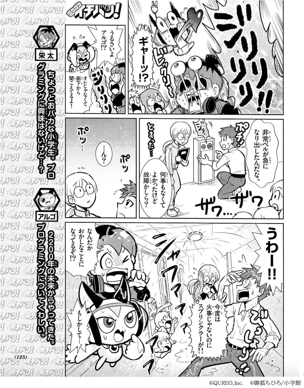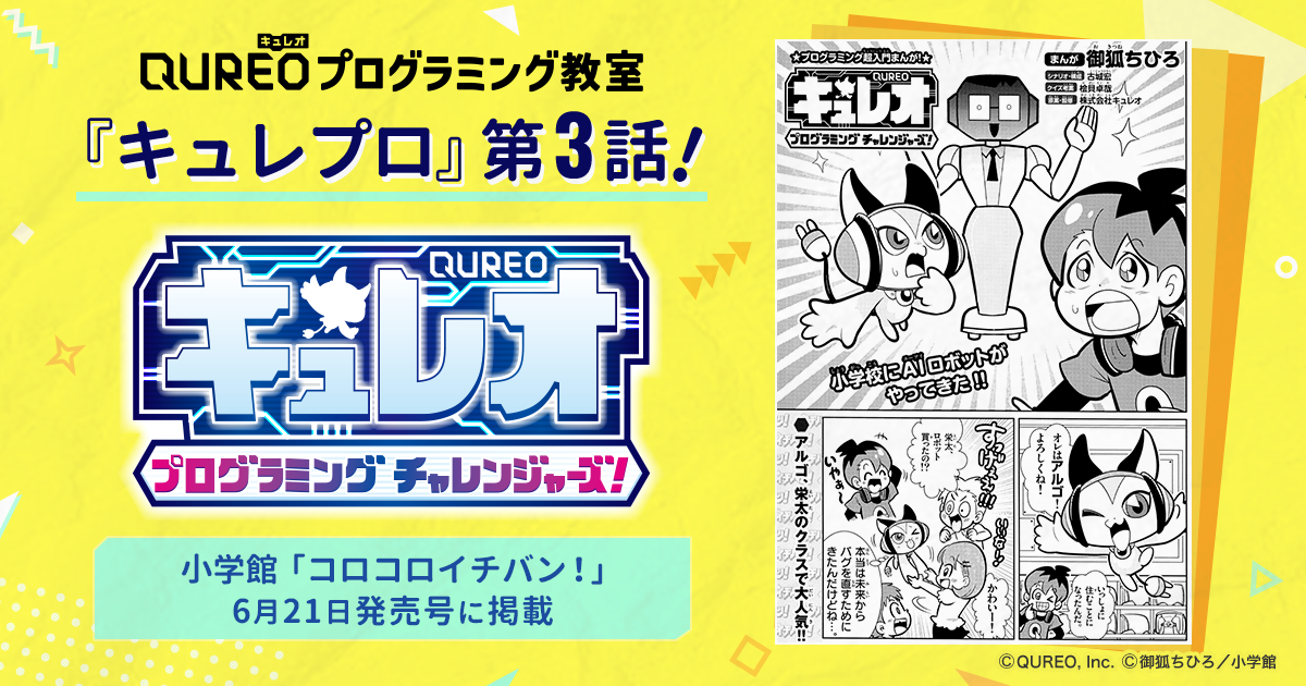 株式会社CA Tech Kidsと株式会社スプリックスとの合弁会社で、プログラミング教材の開発・運営・販売事業を行う株式会社キュレオ(本社:東京都渋谷区、代表取締役社長:上野朝大)は、運営する子ども向けプログラミング教室「QUREO(キュレオ)プログラミング教室」 https://qureo.jp/ が全面監修するプログラミング学習マンガ『キュレオ プログラミングチャレンジャーズ!(通称:キュレプロ)』の最新回となる第3話の内容をお知らせいたします。第3話が掲載される、小学館「コロコロイチバン!」6月21日発売号の本誌ページの一部も公開いたします。