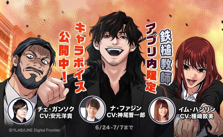 本日6月24日(金)より、神尾晋一郎さん、種﨑敦美さん、安元洋貴さんが出演するキャラクター特別ボイスをLINEマンガアプリ内「鉄槌教師」のマンガの読み終わりにて聞くことができます。ボイスは全部で16種類あり、2022年7月7日(木)18時までの期間限定で公開します。また、ナ教官を演じた神尾晋一郎さんがナレーターとして『鉄槌教師』を紹介する特別動画をLINEマンガ公式YouTubeチャンネルにて公開します。
